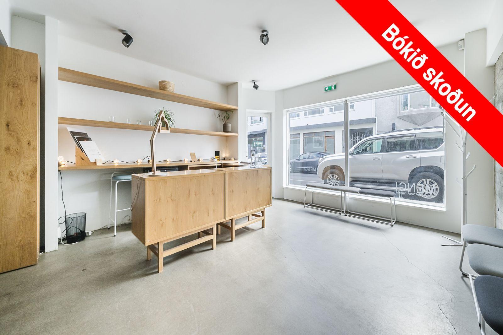 Lýsing eignarinnar: Komið er inn í sal með virkilega stórum og fallegum gluggum sem snúa að Óðinsgötu, flotað gólf og fallegur sjónsteypuveggur, fastar hillur á vegg. Gengið er niður þrjú þrep í innri hluta sama rýmis en þar eru flotuð og parketlögð gólf og ofanbirta um þakglugga. Aukin lofthæð er í innri hluta salarins. Tvær snyrtingar eru innaf sal og eru gólf flotuð og salerni vegghengd. Ræstikompa er innaf annarri snyrtingunni og í henni eru inntaksrými. Innaf sal er einnig eldhús/kaffistofa með flotuðu gólfi, innréttingu góðum gluggum og útgengi á baklóð hússins. Snyrting er innaf kaffistofu.