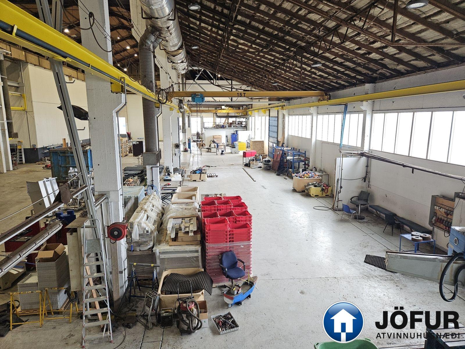Nánari lýsing: Húsnæðið er að mestu einn stór vinnusalur þar sem lofthæð er allt að 15,5 m. þar sem hún er mest. Starfsmannaaðstaða með búningsaðstöðu, salernum, sturtum og saunaklefa. Á millilofti er skrifstofuaðstaða og stór kaffistofa með borðsal. Nægt rafmagn er til staðar í húsinu. Lofthæð undir brúkrana um er 11 m. 5 brúkranar eru til staðar, þ.a. tveir 20T og þrír 5T. Hæð á innkeyrsluhurð er 9 m. og breidd um 8 m. Upphitun er með hitablásurum og að hluta loftræstibúnaði sem er til staðar. Stór loftpressa ásamt þrýstiloftslögnum eru í húsinu. Stórt og rúmgott útisvæði er framan og við hlið hússins. Mötuneyti er í næsta húsi sem leigjandi getur keypt sér aðgang að. VSK leggst við leigufjárhæðina. Tilvalið húsnæði fyrir framleiðslu á stórum byggingareiningum, s.s. einingahúsum ofl.