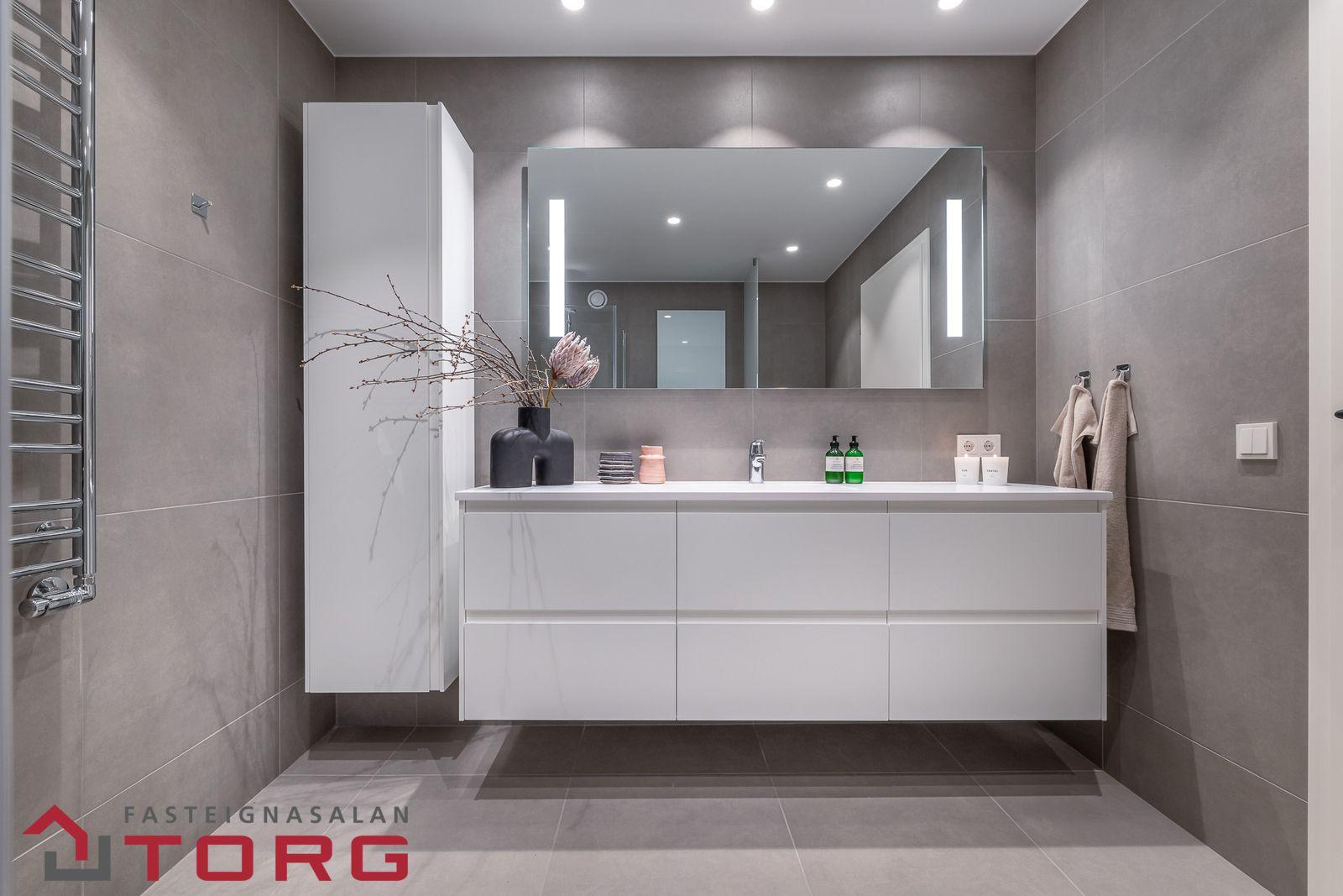Baðherbergi/þvottahús: Baðherbergi/þvottahús eru forframleidd og hífð inn í hús samhliða uppsteypu húsanna. Söluaðili baðherbergjanna er Wilbergs/Bitter ehf. (Parki) og eru þau hönnuð af Boxen samkvæmt norskum stöðlum. Mikið er lagt upp úr vönduðum frágang og er allt efni og búnaður af þekktri og viðurkenndri gerð.