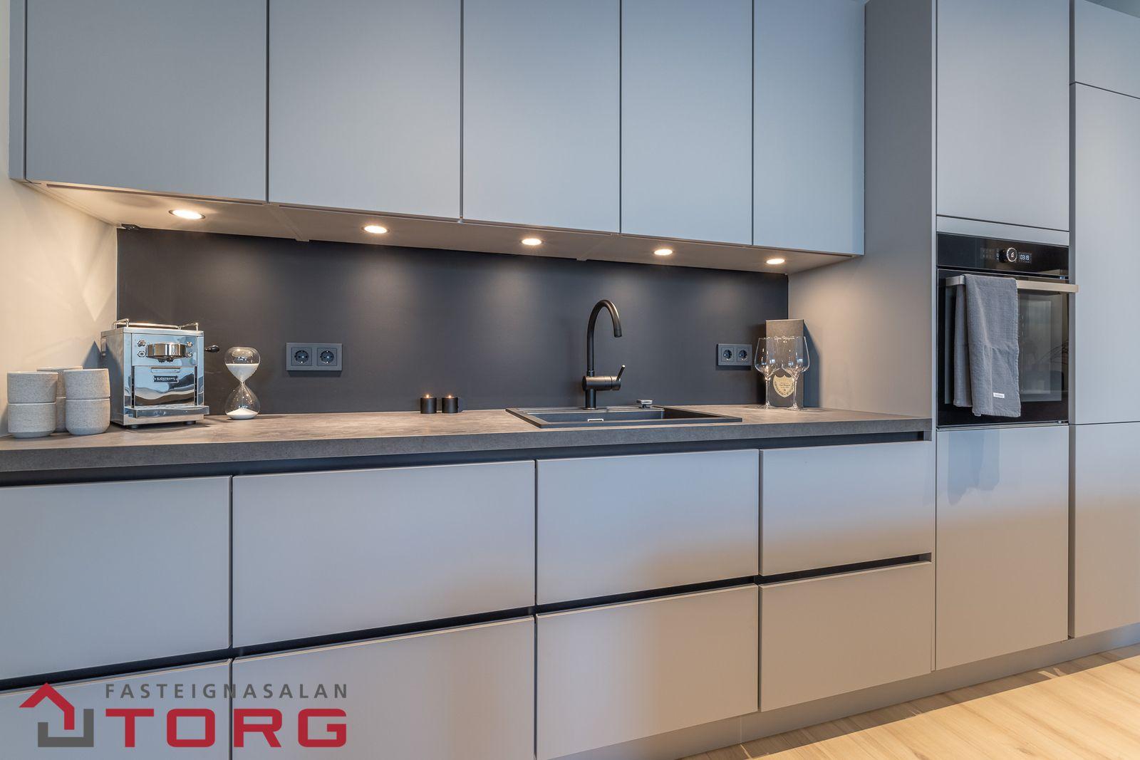 Heimilistæki: Eldhús skilast með blástursofni, spanhelluborði og innbyggðum ísskáp frá Whirlpool sem þjónustað er af Heimilistækjum. Vifta með kolasíu er í efri skápum yfir helluborði en þar sem að helluborð er staðsett á eyju eða tanga er einungis gert ráð fyrir möguleika á að bæta við viftu.