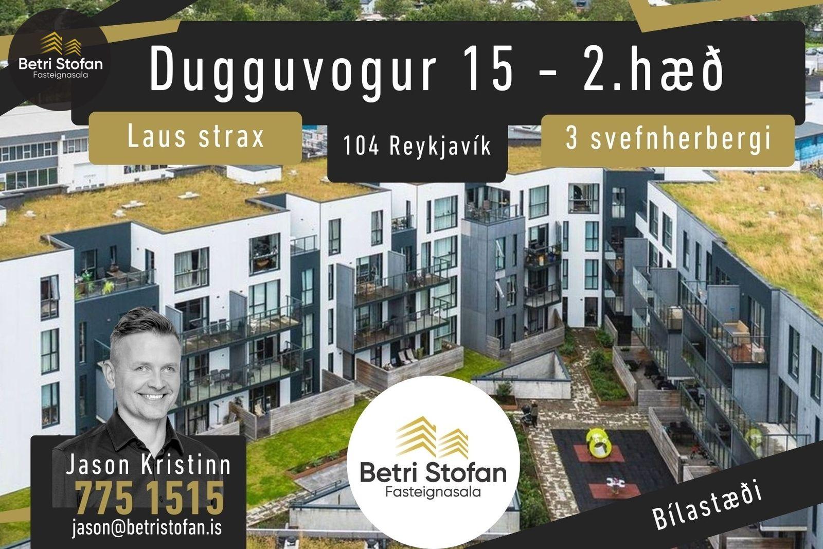 Betri Stofan og Jason Kristinn Ólafsson, sími 7751515 - jason@betristofan.is kynna: Dugguvogur 15, íbúð 0209. Glæsileg nýleg fullbúin 120,8 fm, 4ra herbergja íbúð á 2.hæð í nýlegu vönduðu lyftuhúsi í Vogabyggð ásamt stæði í bílageymslu merkt B41 (209). Laus strax.
