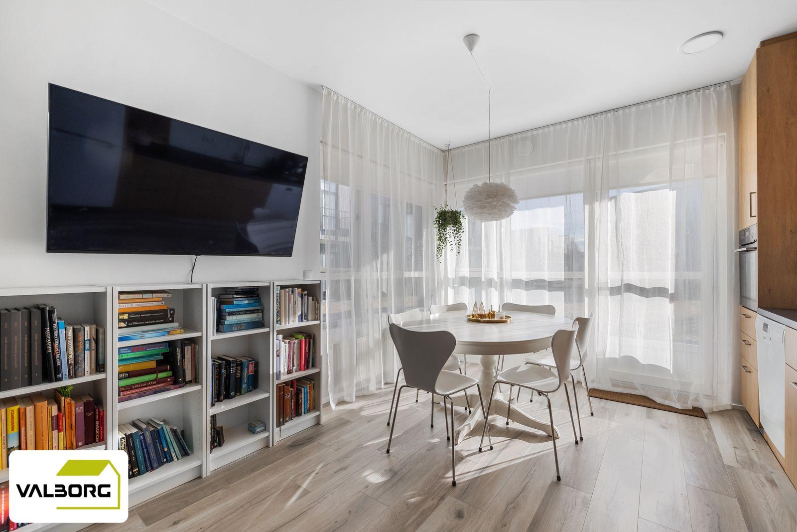 Eldhús er með sérsmíðaðri innréttingu. Spanhelluborð, vifta og bakarofn í vinnuhæð frá AEG. Gert er ráð fyrir einföldum ísskáp í innréttingu, innbyggð uppþvottavél.