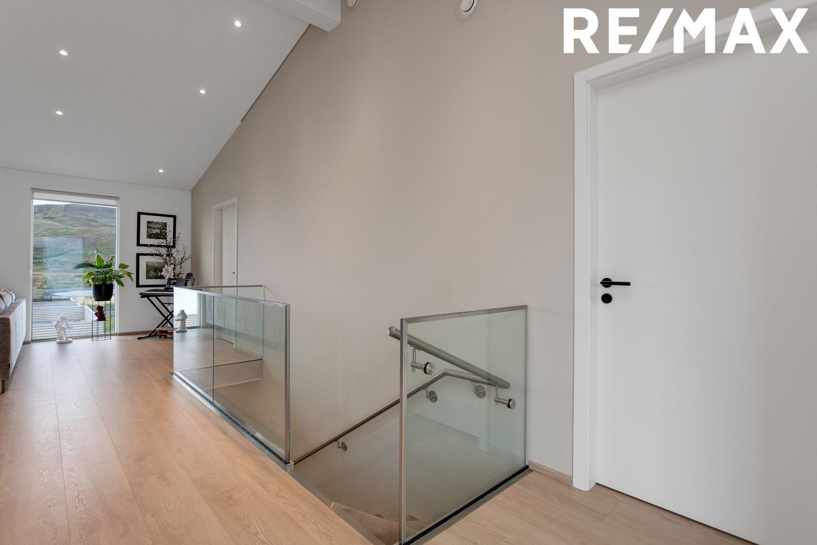 Stigi upp á efri hæð er teppalagður með glerhandriði.