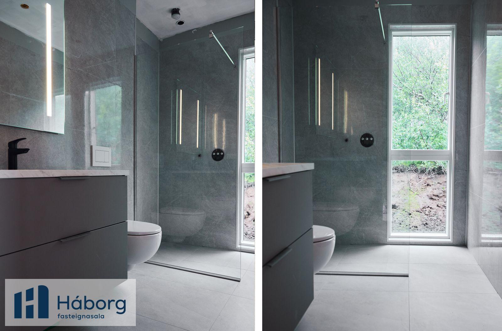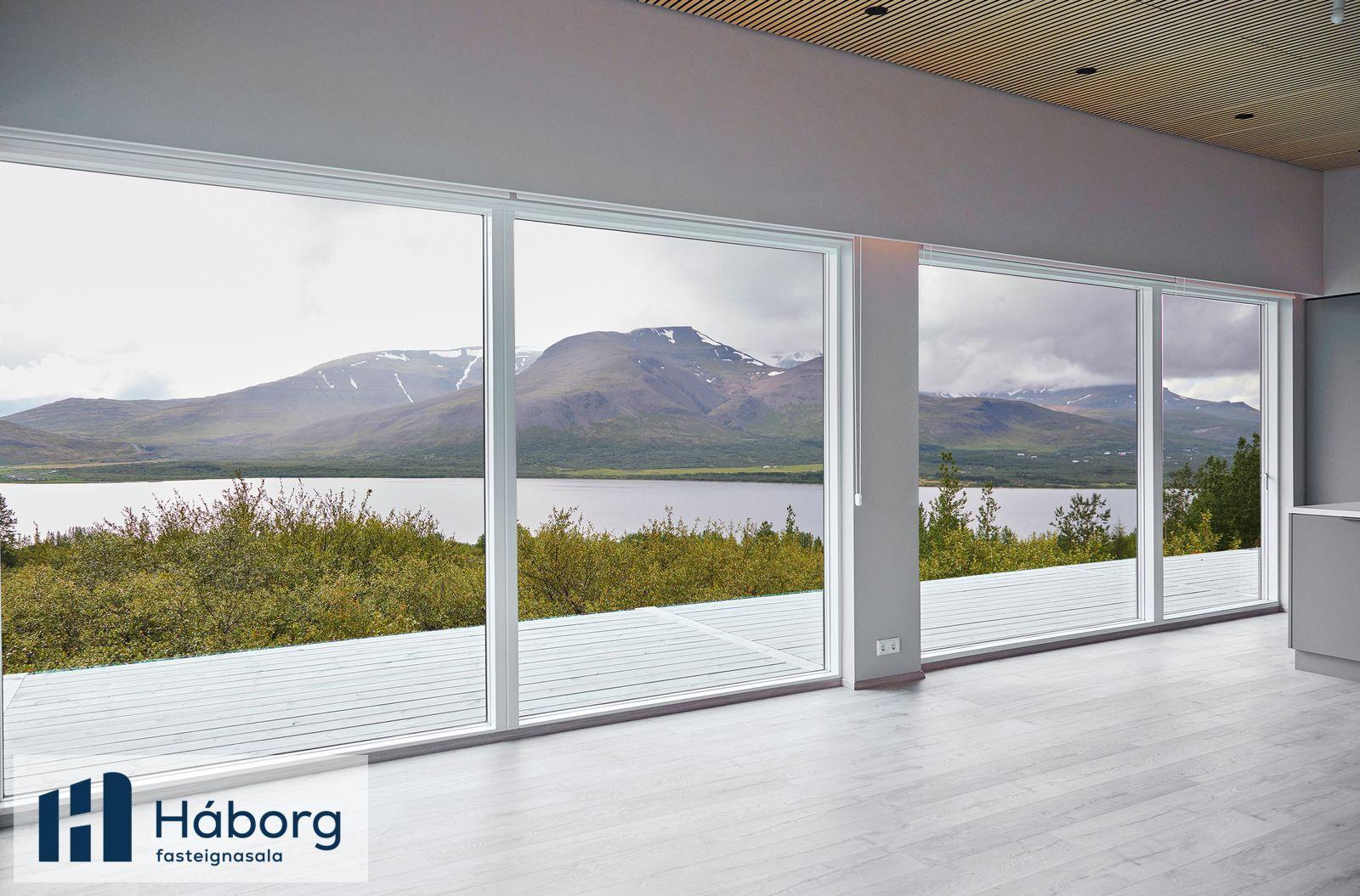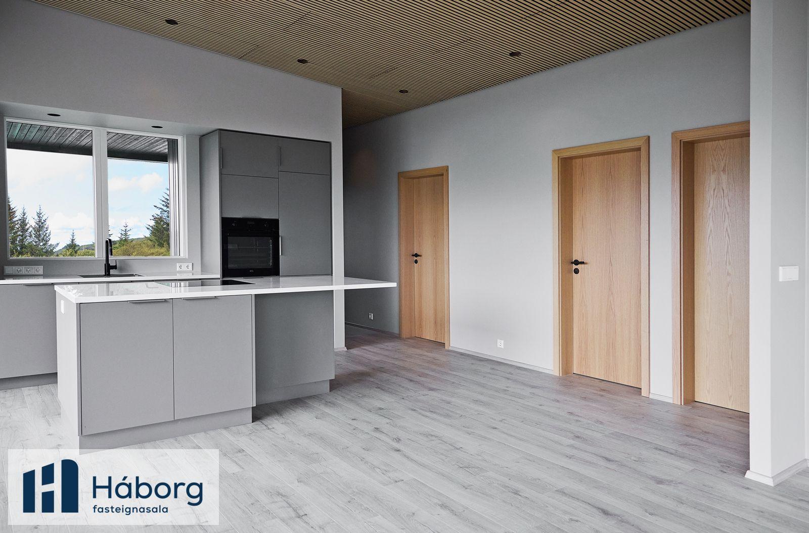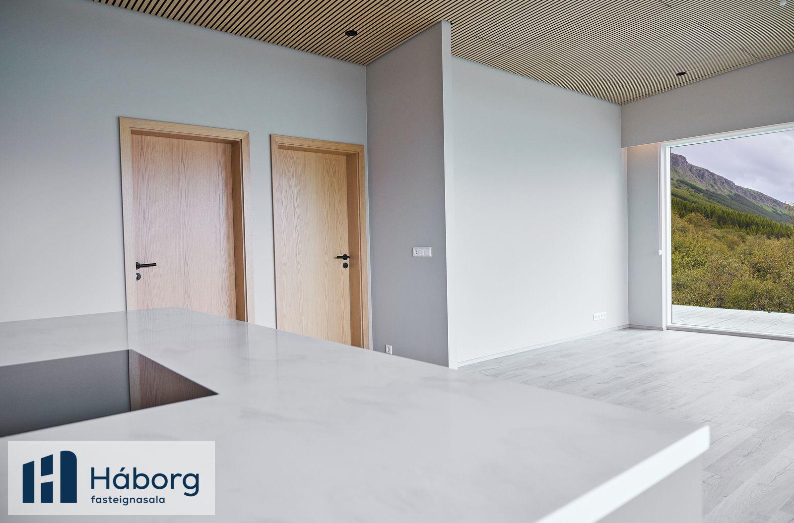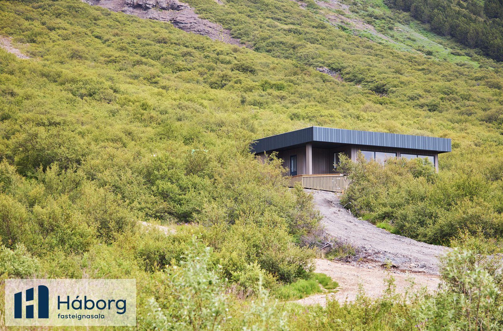 Pantið einkaskoðun, Jórunn lögg.fasteignasali í síma 845-8958 eða jorunn@haborg.isHúsið er stórglæsilegt í alla staði. Stendur hátt uppí lóð, mikið útsýni. Búið að gera veg að húsinu. Húsið er vel skipulagt. Þegar inn í anddyri er komið eru góðir fataskápar, á vinstri hönd er baðherbergi sem er með glugga. Baðherbergið, klætt með Pipo klæðningu og með beint aðgengi að sturtu, vönduð innbyggð tæki á baði, einnig er góð snyrtiaðstaða skápur undir handlaug og spegill fyrir ofan. Síðan koma tvö barnaherbergi sem eru einnig mjög björt með fallegum gluggum og fataskápum. Hjónaherbergið er einnig mjög bjart með góðum fataskápum. Loftin í svefnherbergjum eru klædd með dúk.