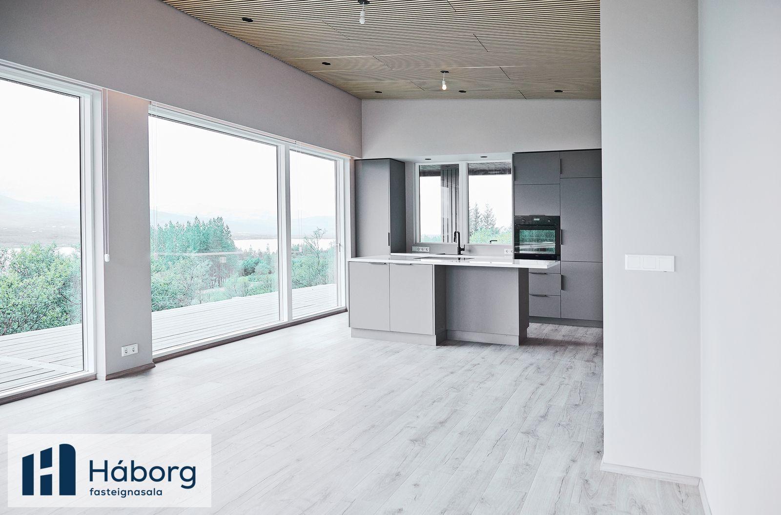 Alrýmið með gólfsíðum gluggum. Alrýmið sem er eldhús með eyju og opnar stofur. Í stofu eru stórir gluggar með miklu útsýni og mjög rúmgott að stærð 46,2 fm. Úr alrými er rennihurð út á pall. Eldhúsinnréttingin er sérsmíðaðuð innrétting með eyju sem hægt er að sitja við, einnig er uppþvottavél innfelld í innréttingu ásamt kæliskáp með frysti. Borðplötur í eldhúsi frá Fantofell. Einstakt útsýni úr eldhúsi og stofum.