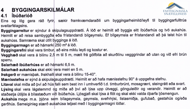 Samkvæmt skipulagsskilmálum er heimilt að byggja eitt íbúðarhús og tvö aukahús á lóðinni. Heildarbyggingarmagn má vera allt að 250 fm. og skal byggingarefni vera timbur eftir því sem kostur er.