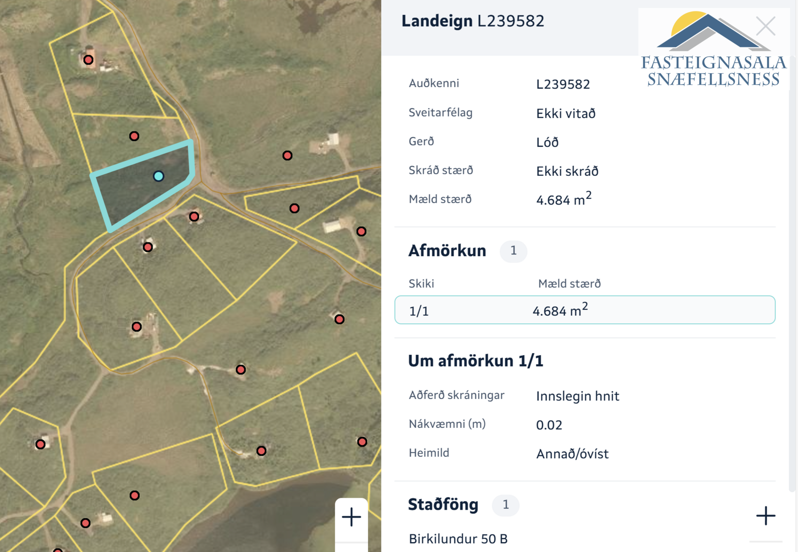 Lóðin er 4686,8 fm að stærð og er skipulögð sem íbúðarhúsalóð.