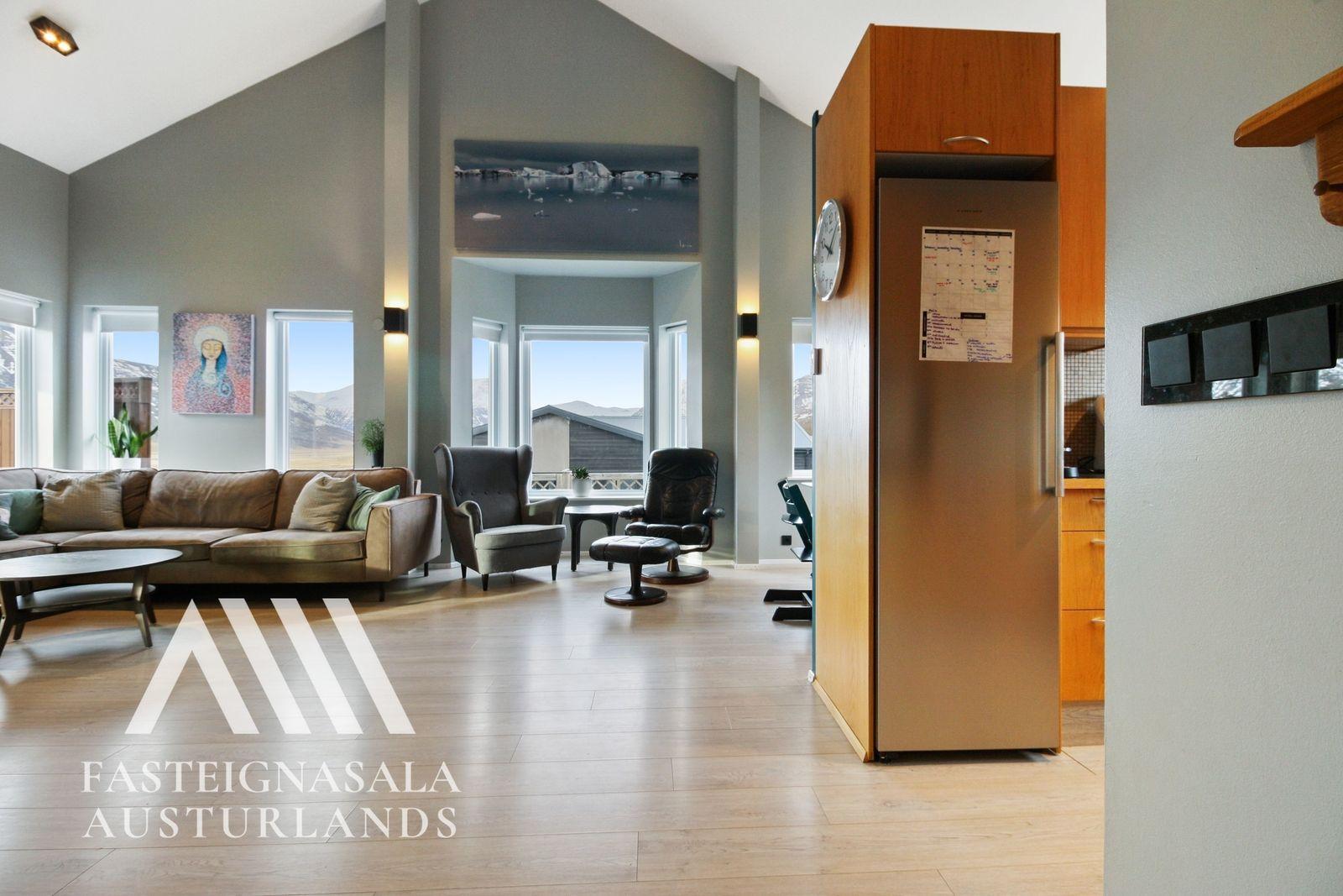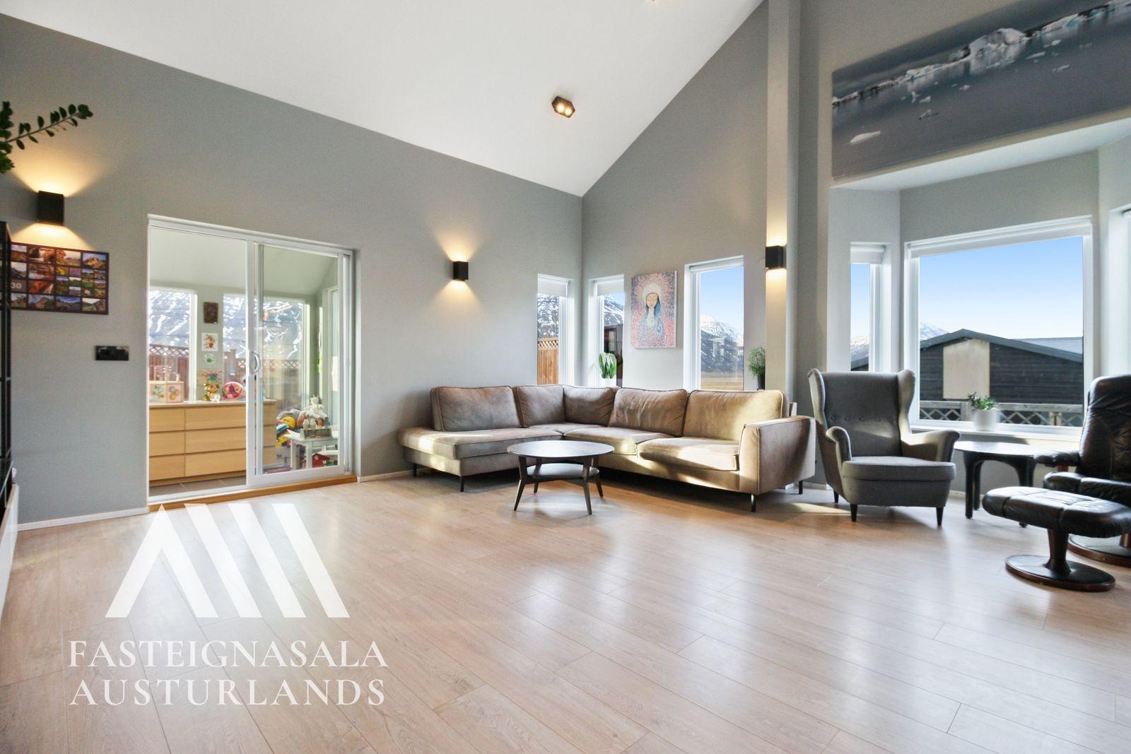 Stofa/borðstofa: Gott opið rými með mikilli lofthæð og mörgum gluggum, borðstofa er aðskilin en í sama rými.