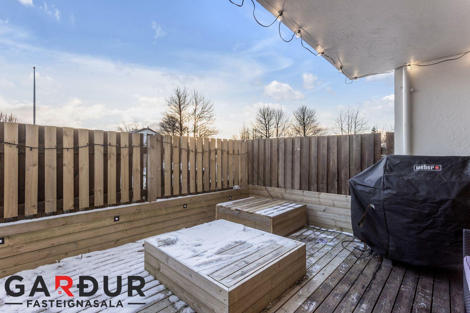Lokaður pallur var stækkaður og gert borð í miðju yfir brunn sem er þar. Stór garður og stórt og flott leiksvæði fyrir framan.