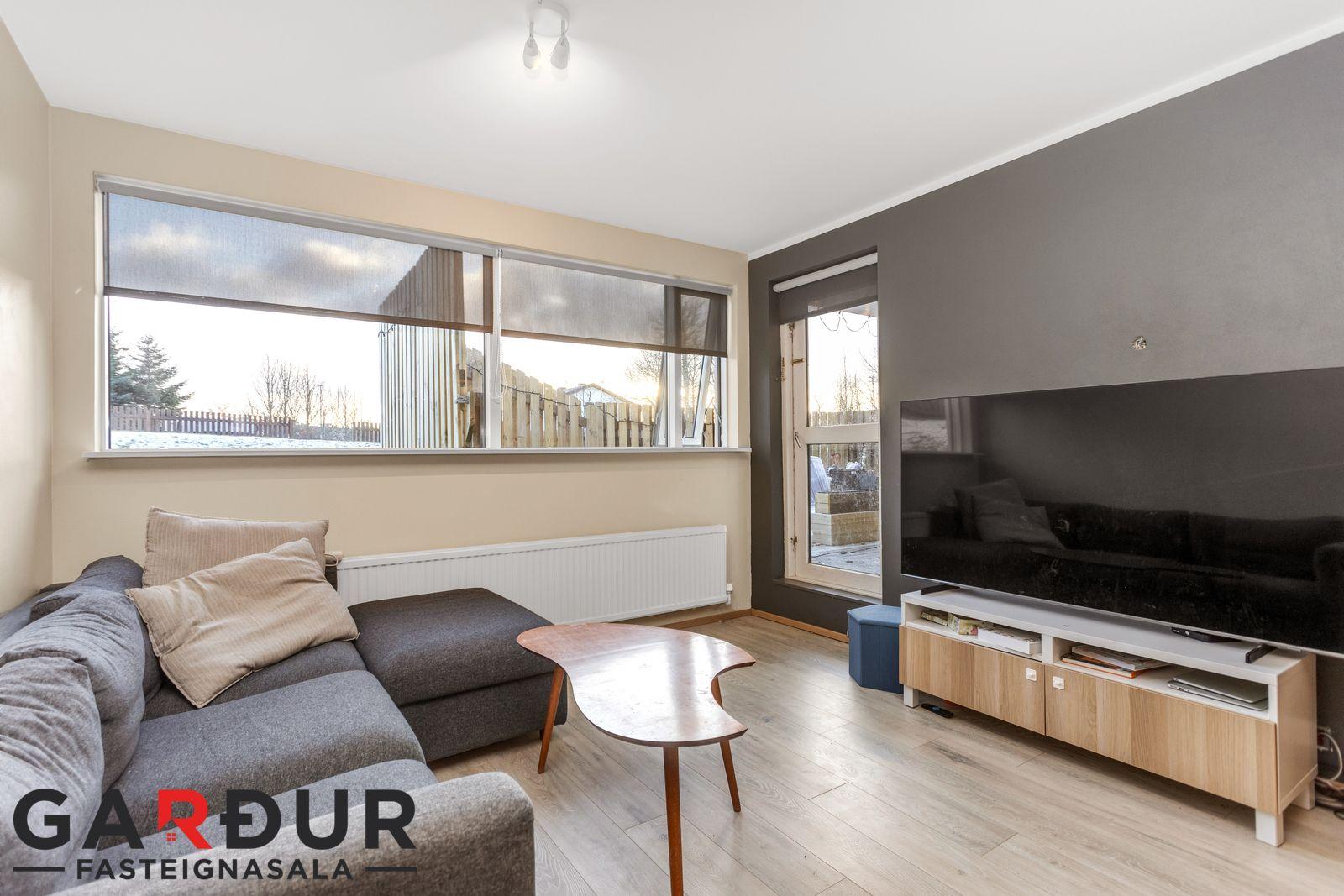 Stofa: Björt og opin með parketi á gólfi, útgengt á sér sólpall.