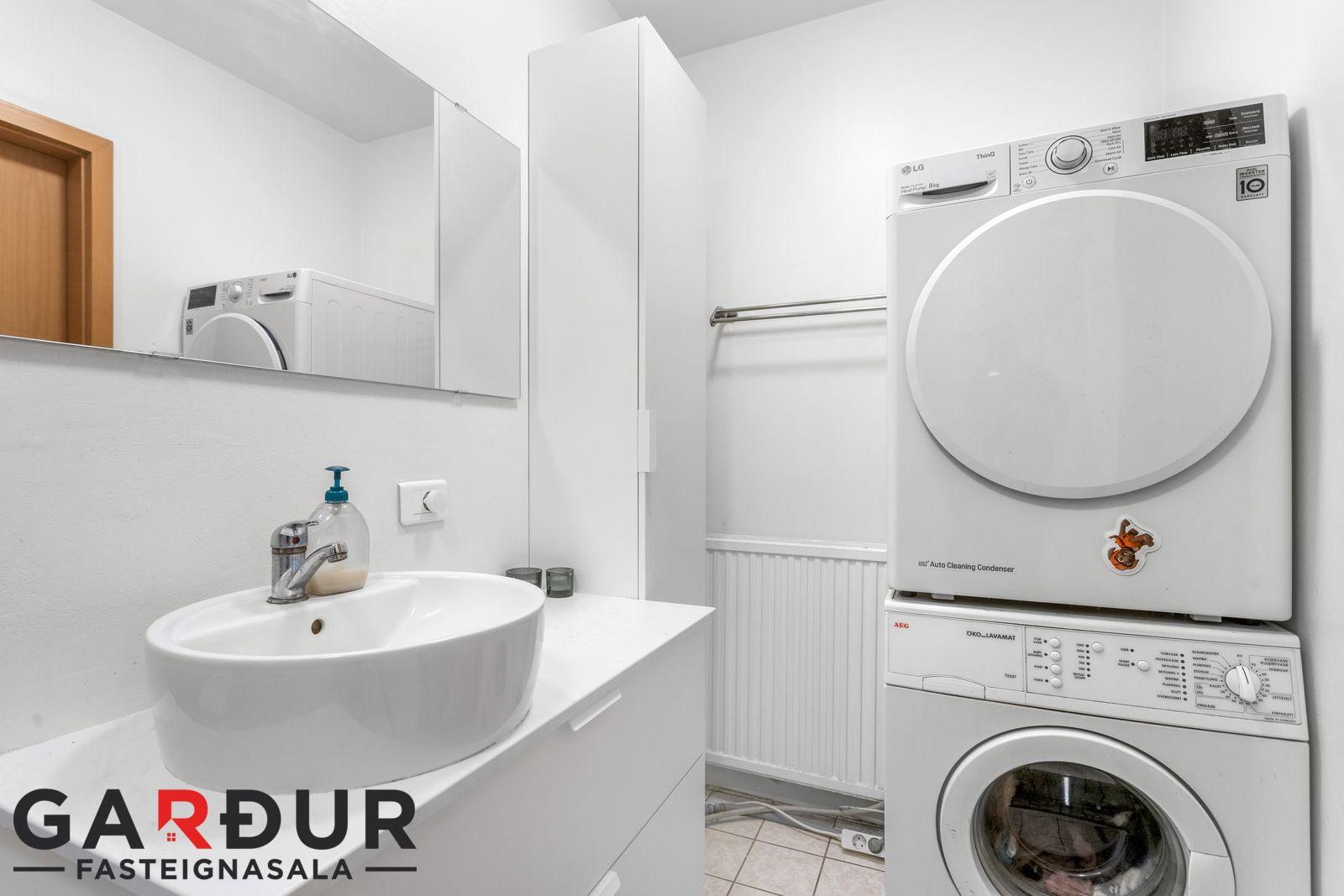 Baðherbergi: Hvít innrétting með handlaug, baðkar m/sturtu, wc, flísar á gólfi og við baðkar. Tengi fyrir þvottavél og þurrkara.