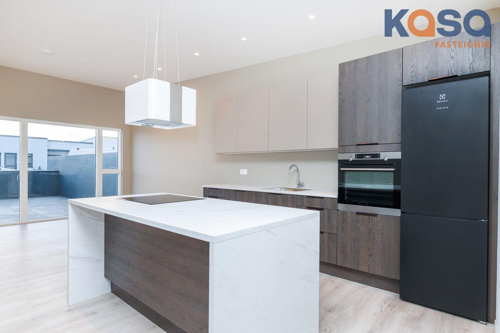 Eldhús: er í opnu rými með stofu þar er parket á gólfum. Innrétting og eyja og keramik helluborð í eyju. Ísskápur og uppþvottavél fylgja með í kaupum.