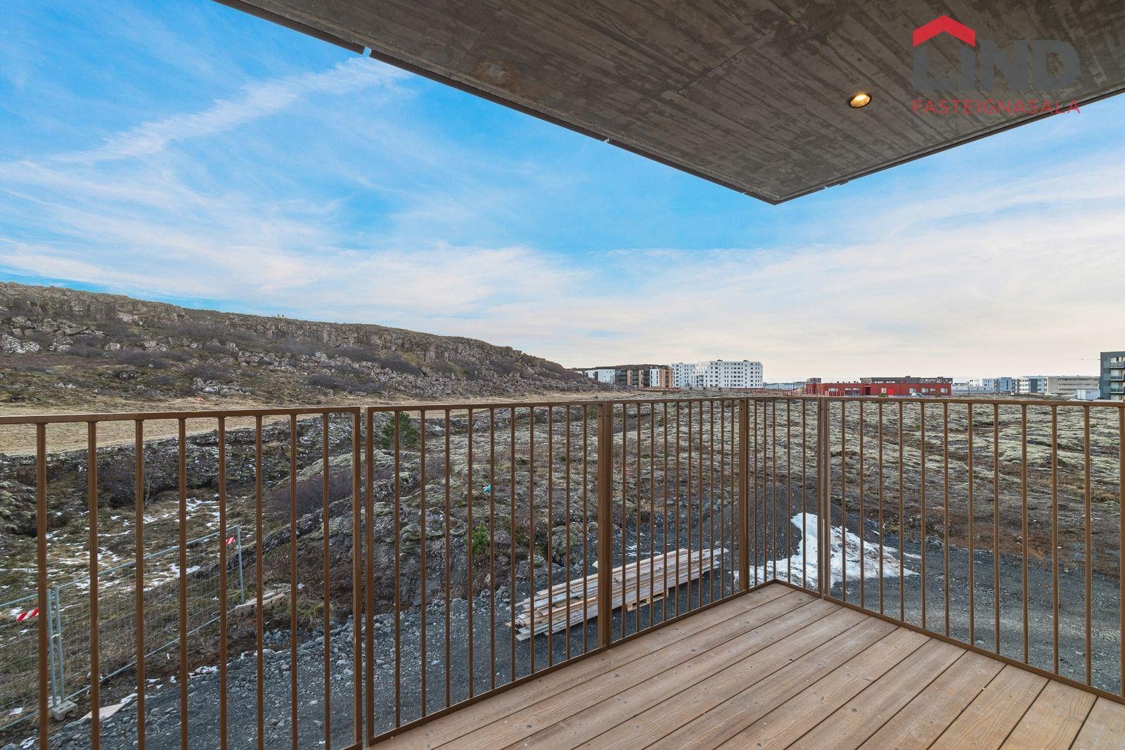 Íbúð 501: Er 119,4 fermetra 3ja herbergja íbúð á fimmtu hæð með stórum 34,4 fermetra svölum og sérmerktu bílastæði í lokuðum bílakjallara. Þar af er geymsla 19,4 fermetrar. Afhending er áætluð mars-apríl 2026 en þó með fyrirvara um að öryggisúttekt sé komin á húsið.