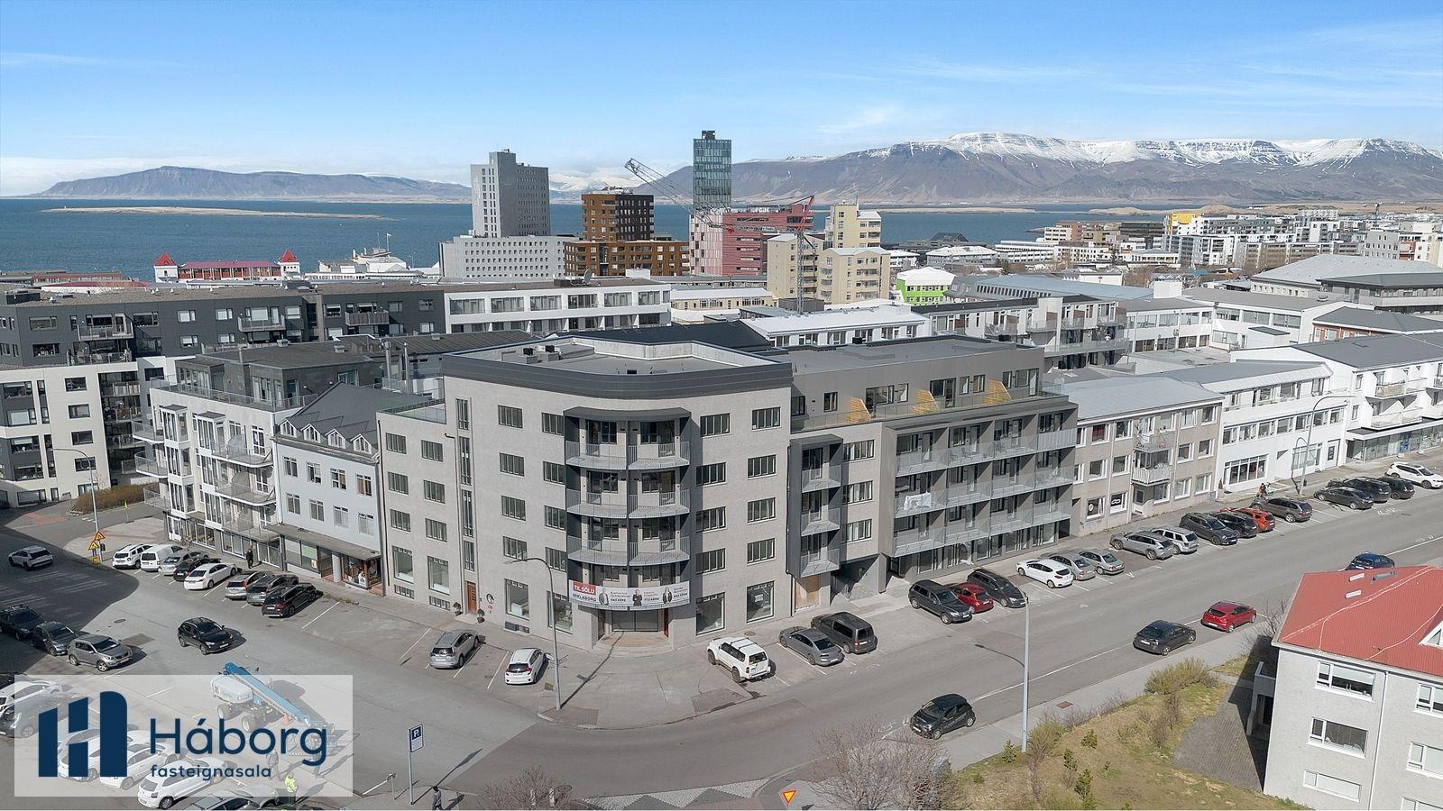 Skipholt 1 ný endurbyggt hús, aðalinngangur við Stórholt. Íbúð 505 á efstu hæð með lofthæð um 3,40 m, Rúmgóða 3ja herbergja íbúð í fallegu enduruppgerðu lyftuhúsi í útjaðri miðborgarinnar. Eignin er mjög heillandi staðsett í boganum sem setur mikinn svip á bygginguna. Inngangur frá svalagangi. Forstofa með góðum skápum, Tvö svefnherbergi 10,7 fm og 12,8 fm. Stórt bjart alrými með útgengi á 4,1 fm bogadregnar suðursvalir. Baðherbergi með sturtu og þvottaaðstöðu. Harðparket á gólfum og innbyggður ísskápur og uppþvottavél. Sjálf íbúðin er 88,9 fm og geymsla í kjallara 9,8 fm. Einstakar sameiginlegar þaksvalir á 5. hæð. Örstutt göngufæri í matvöruverlslun og niður á Hlemm sem er að umbreytast í grænt og vænt almenningsrými.