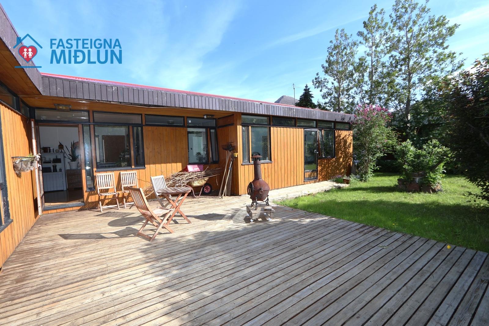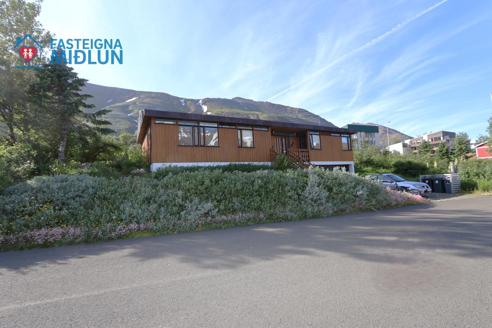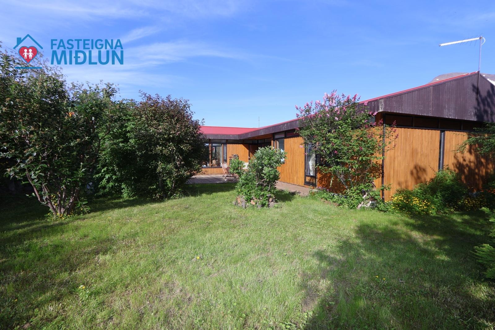Um er að ræða einbýlishús með stórum garði og frábæru útsýni og skjólgóðum grónum garði. Eignin skiptist í efri og neðri hæð með bílskúr. Efri hæð samanstendur af stofu, eldhúsi, tveimur baðherbergjum, þvottahúsi, fimm svefnherbergjum og andyri. Stofa/borðstofa er mjög rúmgóð með miklu gluggaplássi og sérútgang út á pall í garði. Eldhús liggur við stofu með léttum vegg á milli. Einnig er aflokað búr/geymsla með glugga og opnanlegu fagi inn af eldhúsi með léttum vegg. Þvottahús er með sérútgang og glugga með opnanlegu fagi. Hjónaherbergi er með sérútgang út í garð. Neðri hæð eignarinnar býður upp á marga möguleika og er að hluta til óklárað en grafið var út úr kjallara og jarðvegur lagður og járnabundinn en eftir á að steypa gólf að hluta. Neðri hæð samanstendur því að bílskúr og geymslu í dag. Sérútbúin geymsla er með sérinngang sem hugsuð var fyrir sorpgeymslu við hlið bílskúrs.