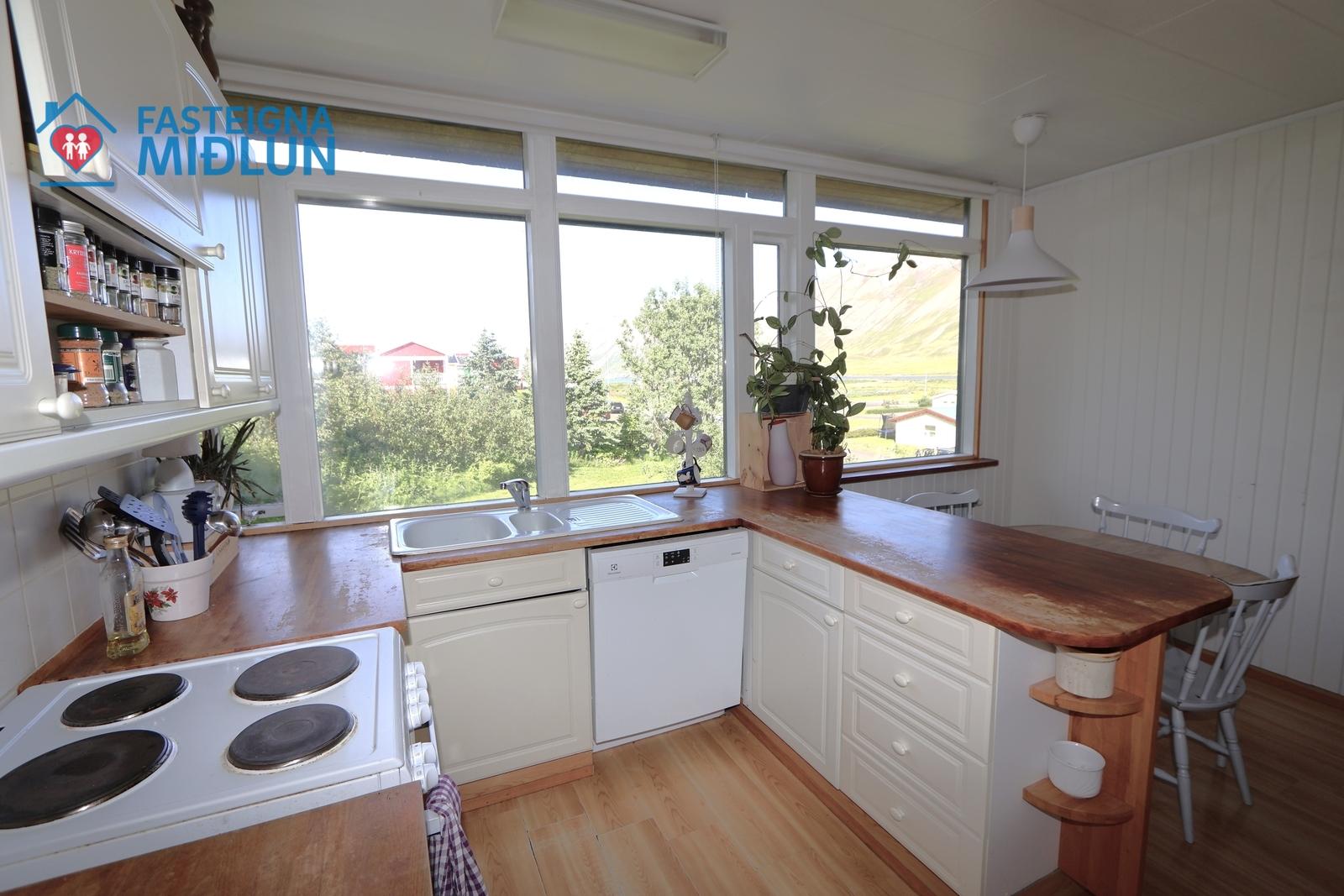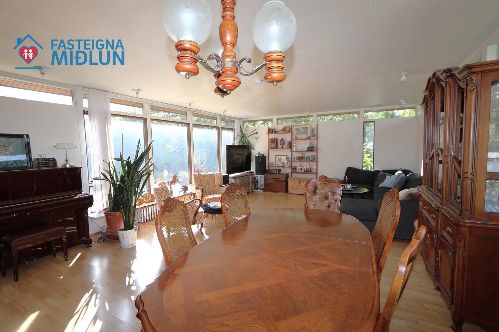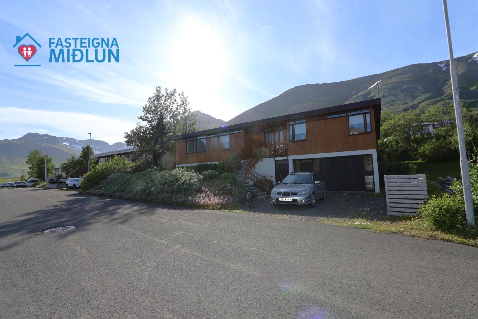 Um er að ræða einbýlishús með stórum garði og frábæru útsýni og skjólgóðum grónum garði. Eignin skiptist í efri og neðri hæð með bílskúr. Efri hæð samanstendur af stofu, eldhúsi, tveimur baðherbergjum, þvottahúsi, fimm svefnherbergjum og andyri. Stofa/borðstofa er mjög rúmgóð með miklu gluggaplássi og sérútgang út á pall í garði. Eldhús liggur við stofu með léttum vegg á milli. Einnig er aflokað búr/geymsla með glugga og opnanlegu fagi inn af eldhúsi með léttum vegg. Þvottahús er með sérútgang og glugga með opnanlegu fagi. Hjónaherbergi er með sérútgang út í garð. Neðri hæð eignarinnar býður upp á marga möguleika og er að hluta til óklárað en grafið var út úr kjallara og jarðvegur lagður og járnabundinn en eftir á að steypa gólf að hluta. Neðri hæð samanstendur því að bílskúr og geymslu í dag. Sérútbúin geymsla er með sérinngang sem hugsuð var fyrir sorpgeymslu við hlið bílskúrs.