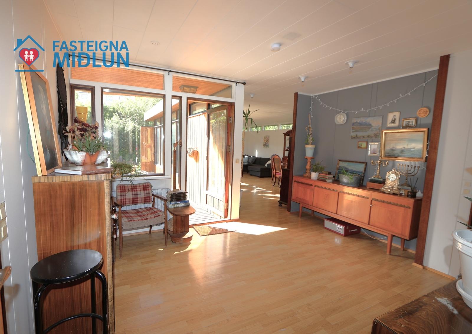 Þvottahús: er einnig inn af eldhúsi með flísum á gólfi. Sérútgangur er út á pall að framan úr þvottahúsi. Gluggar með opnanlegu fagi.