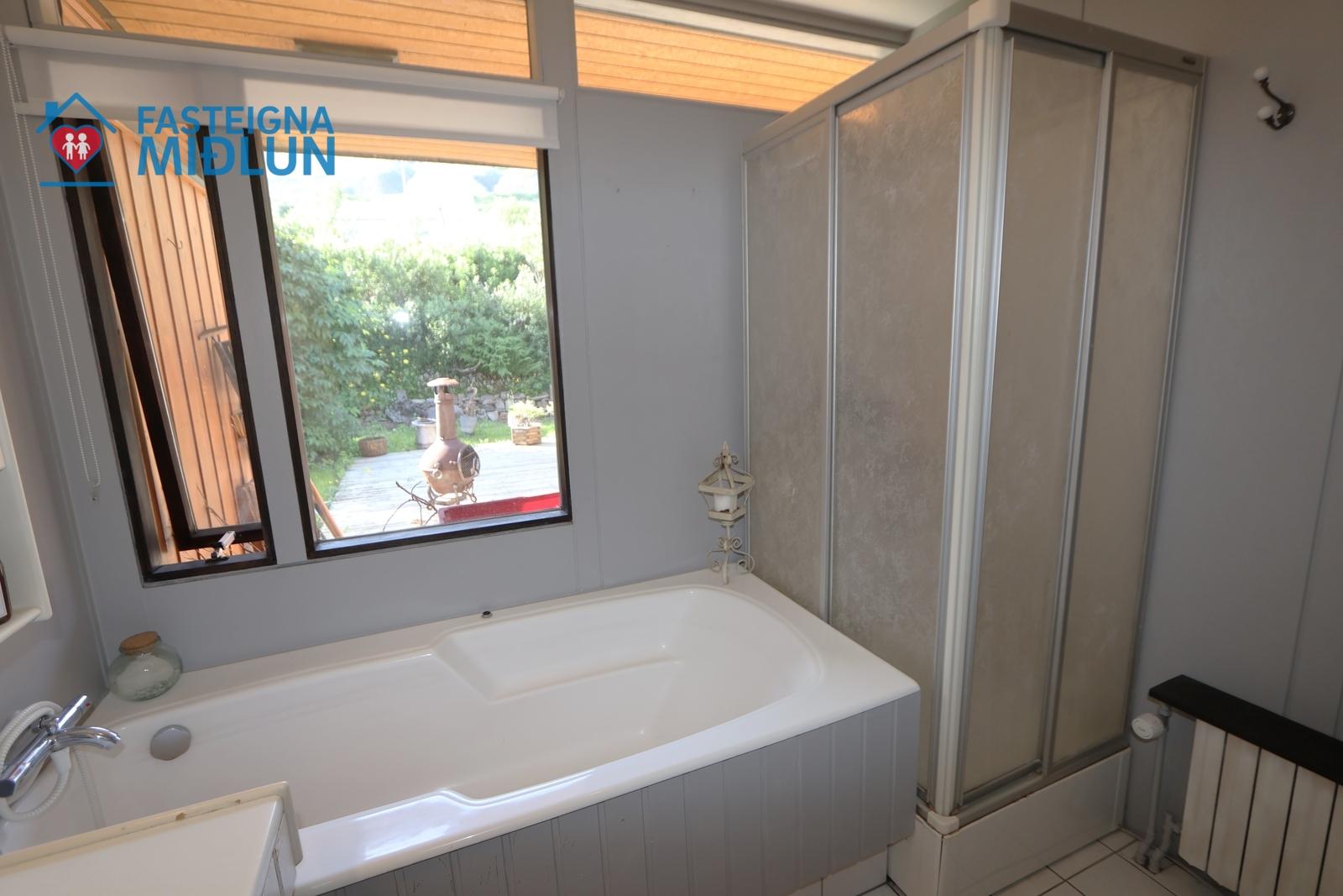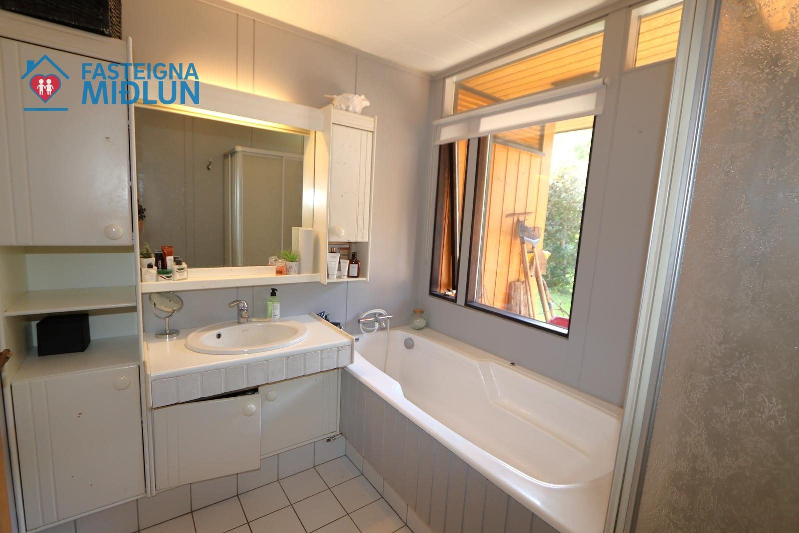 Baðherbergi: eru tvö annað inn af anddyri sem er lítið með flísum á gólfi, vask og klósetti. Hitt er stærra og er staðsett inn á svefnherbergisgangi. Í því er baðkar og frístandandi sturtuklefi, hvít innrétting, vaskur og gólftengt klósett.