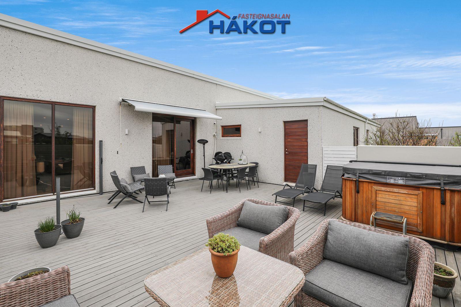 Stofa/borðstofa (parket, útgangur út á Verönd með heitum pott, markísa, skjólgirðing).