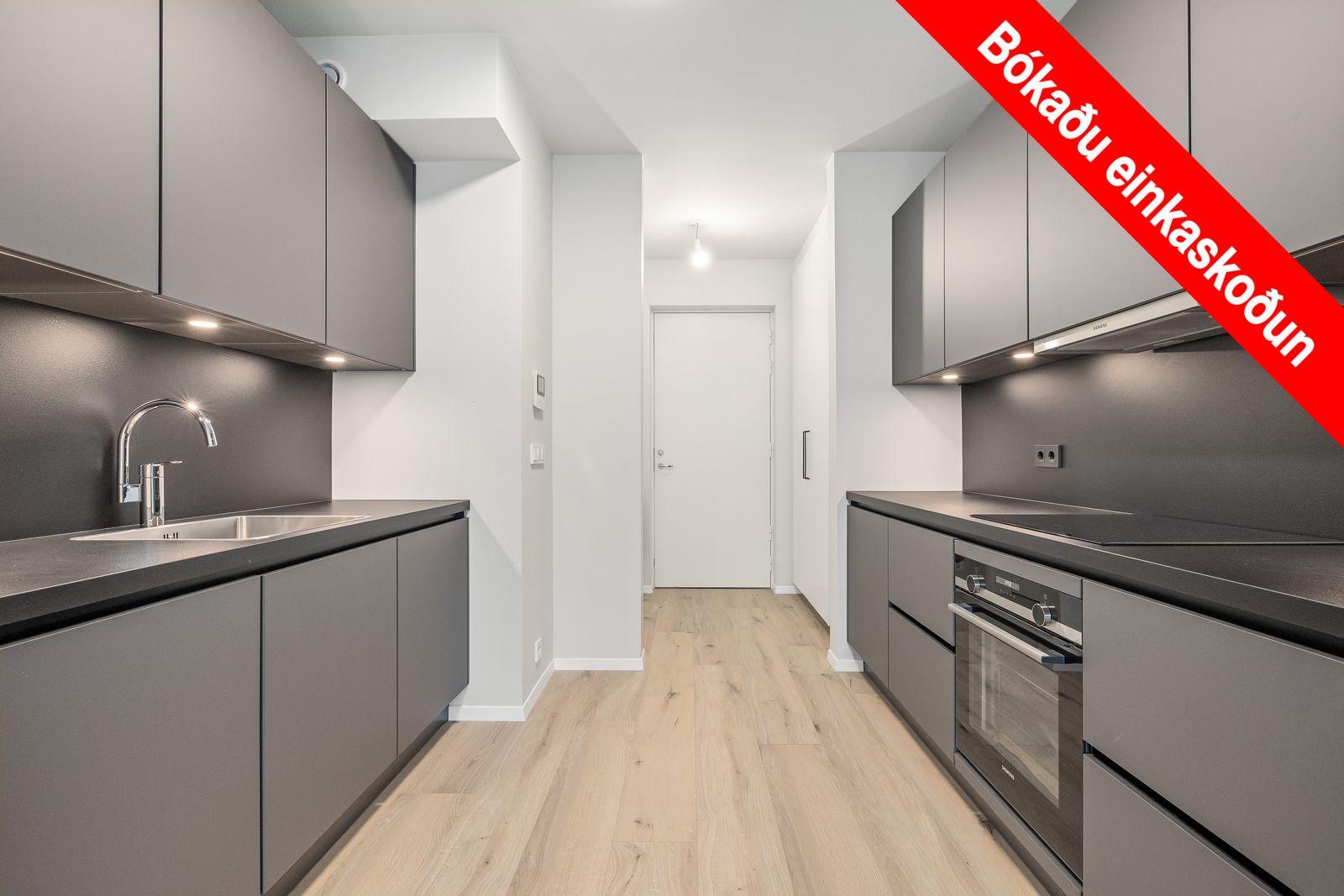 Eldhús: Hurðir og forstykki eru í dökkum gráum lit, touch Line N. Borðplötur eru plastlagðar í dökkum lit. Stærðir innréttinga eru skv. teikningum og verða í stöðluðum stærðum. Ljós eru undir efri skápum. Hnífaparabakki og sorpflokkunareining fylgir eldhúsum. Elhúsraftæki eru frá Siemens. Ljós verða undir efri skápum í eldhúsi. Ísskápur og uppþvottavél verða innbyggð.