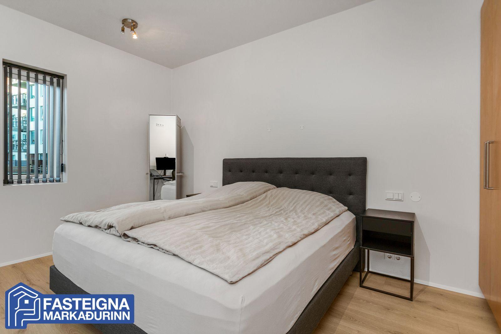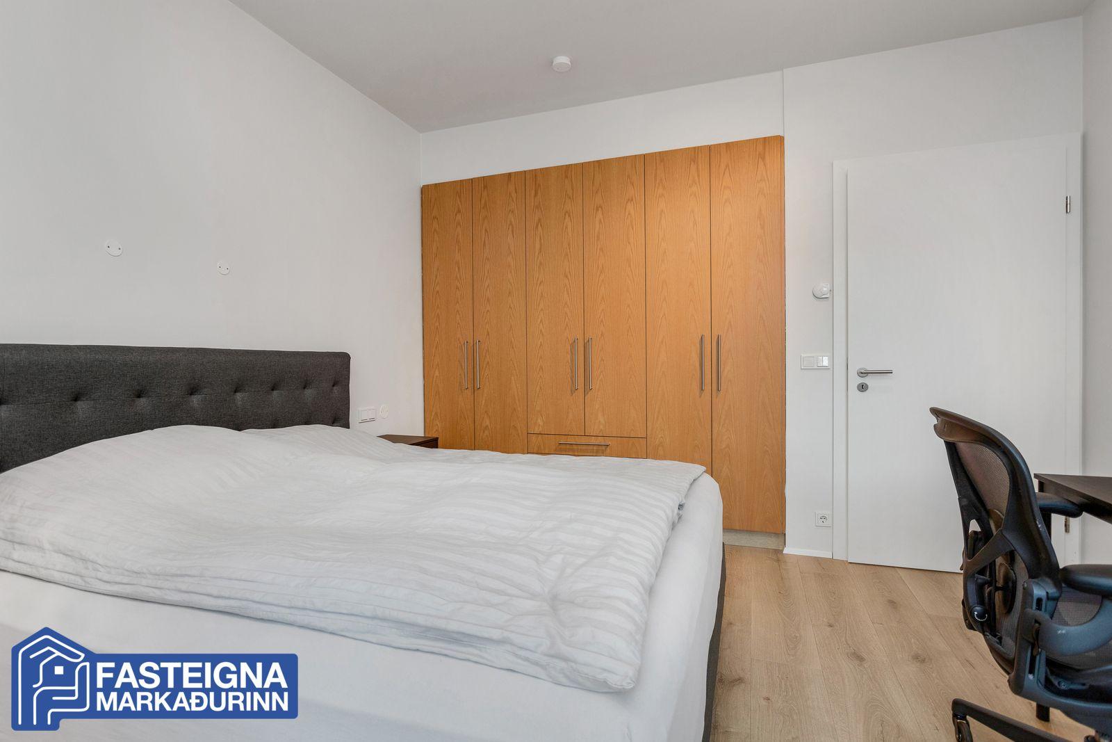 Hjónaherbergi, rúmgott, parketlagt og með innbyggðum fataskápum.