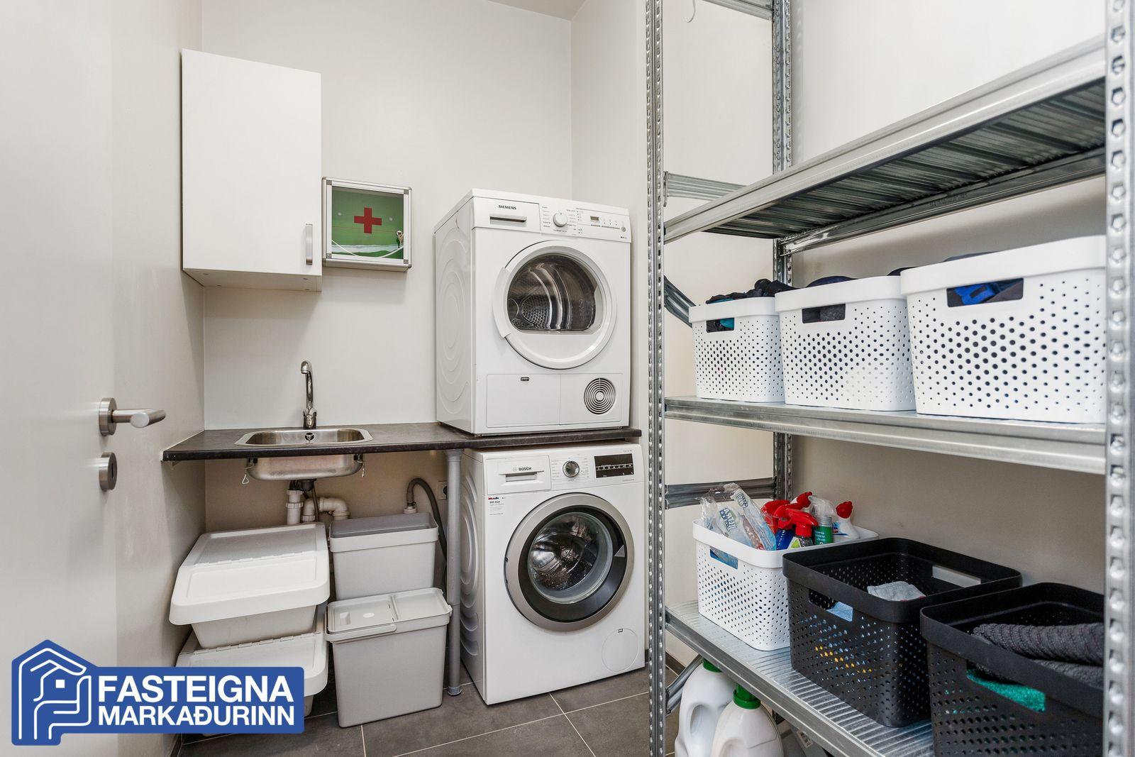 Sameiginleg stór hjóla og vagnageymsla með útgengið á lóð til norðurs.Húsið að utan lítur vel út, er klætt og því viðhaldslítið og sameign er öll mjög snyrtileg og það eru tvær lyftur.
