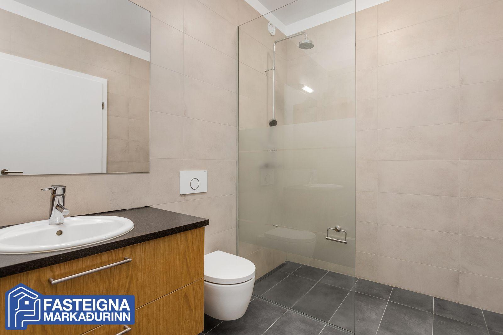 Baðherbergi, rúmgott, flísalagt gólf og veggir, handklæðaofn, innrétting, vegghengt wc og stór flísalögð gólfsturta með sturtugleri.