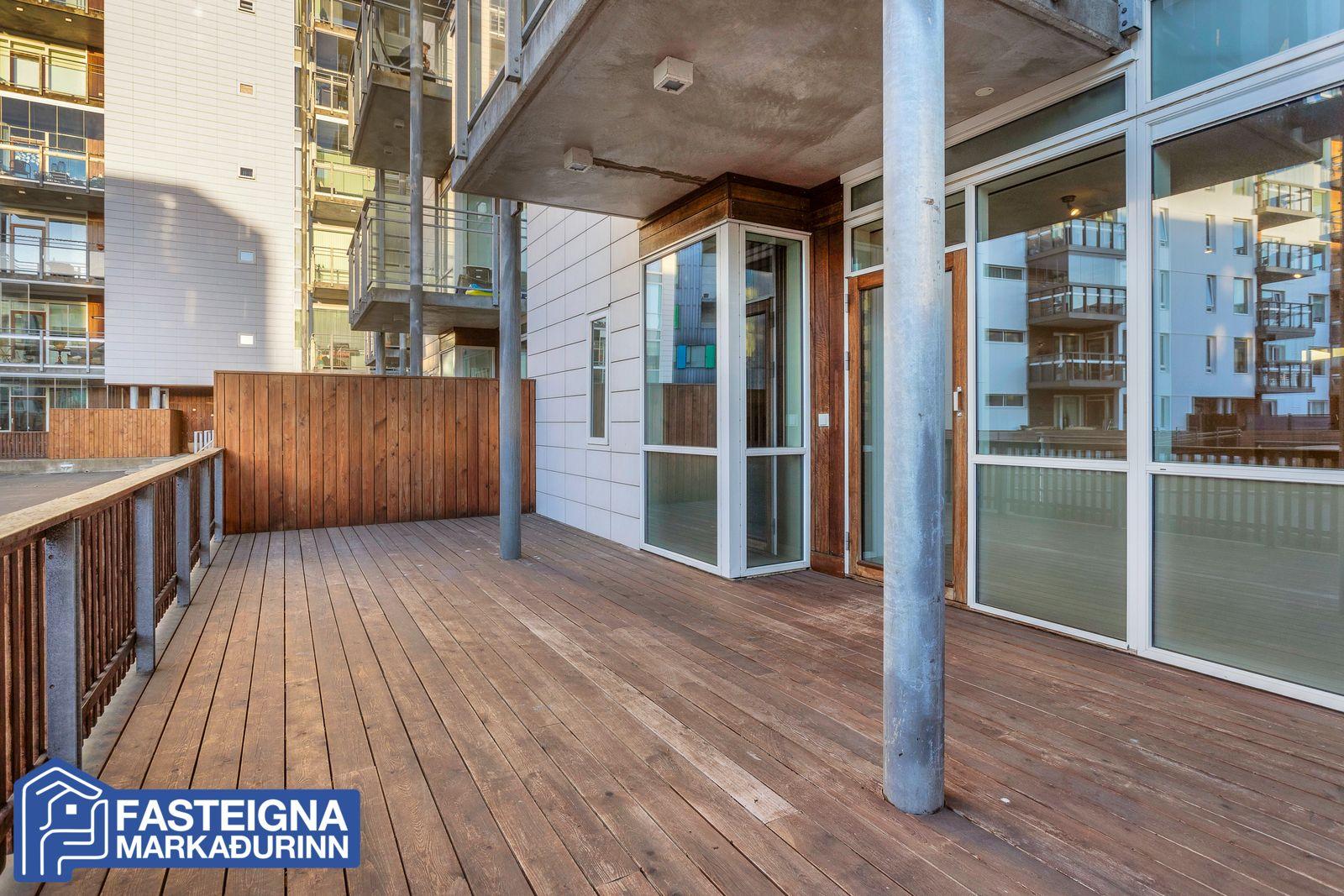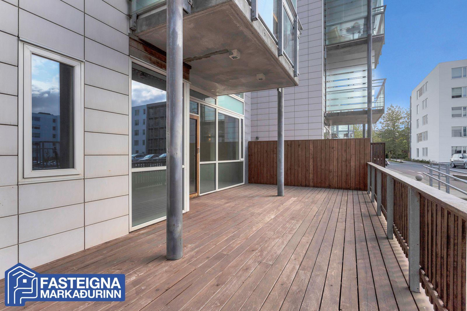 Stofa, parketlögð, björt og rúmgóð með gólfsíðum gluggum og útgengi á um 32,5 fermetra nýlegir viðarverönd til vesturs með skjólveggjum. Heimilt er að byggja yfir verönd að hluta.