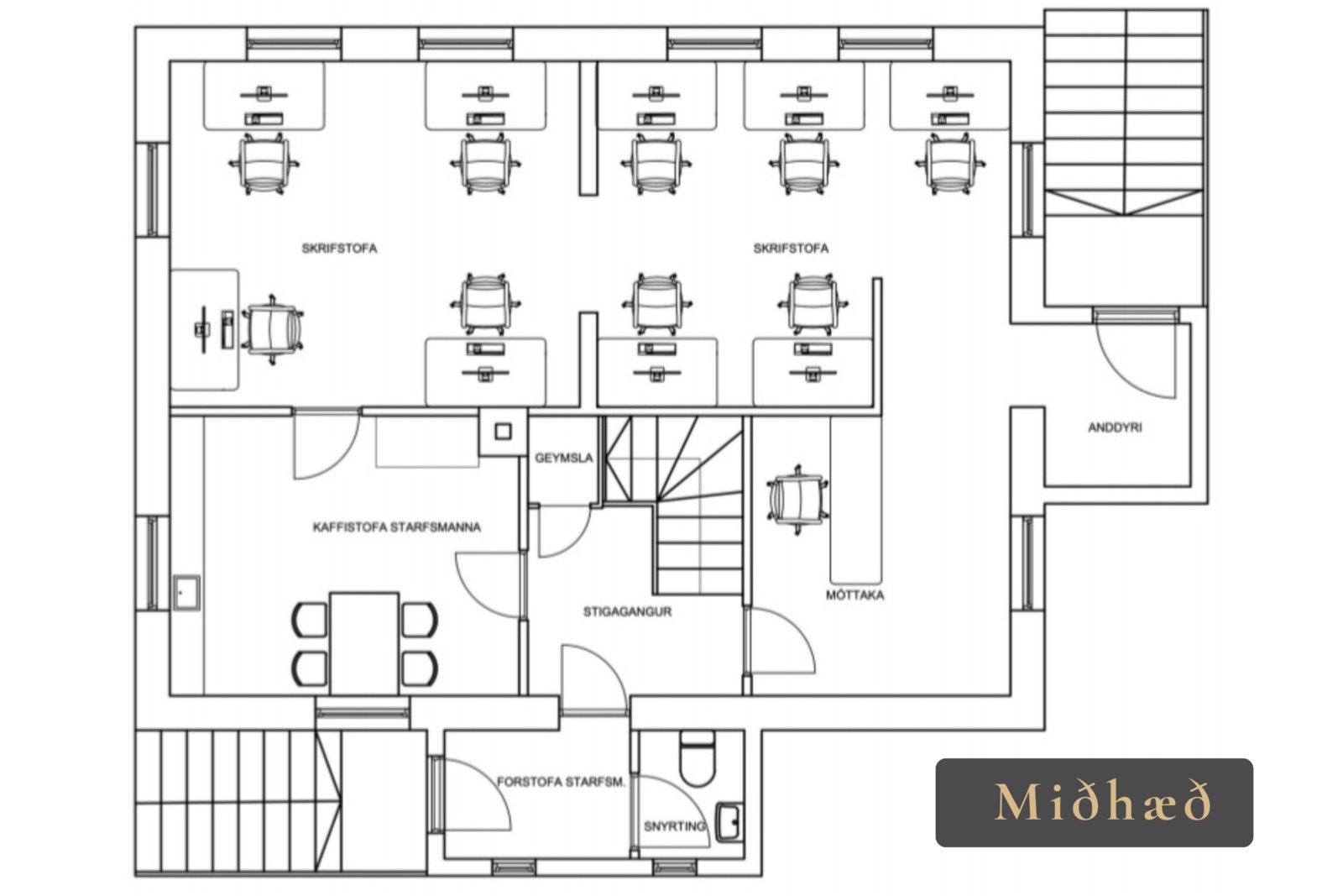 Miðhæðin skiptist í stórt samliggjand rými þar sem finna má skrifstofur, afstúkað rými sem nýta má sem móttöku, eldhús með lítilli innréttingu með vaski en engum eldunartækjum. Hár eldhússkápur er einnig í eldhúsinu ásamt innbyggðum ísskáp. 2 forstofur eru á hæðinni ásamt lítilli ræstikompu og snyrtingu.