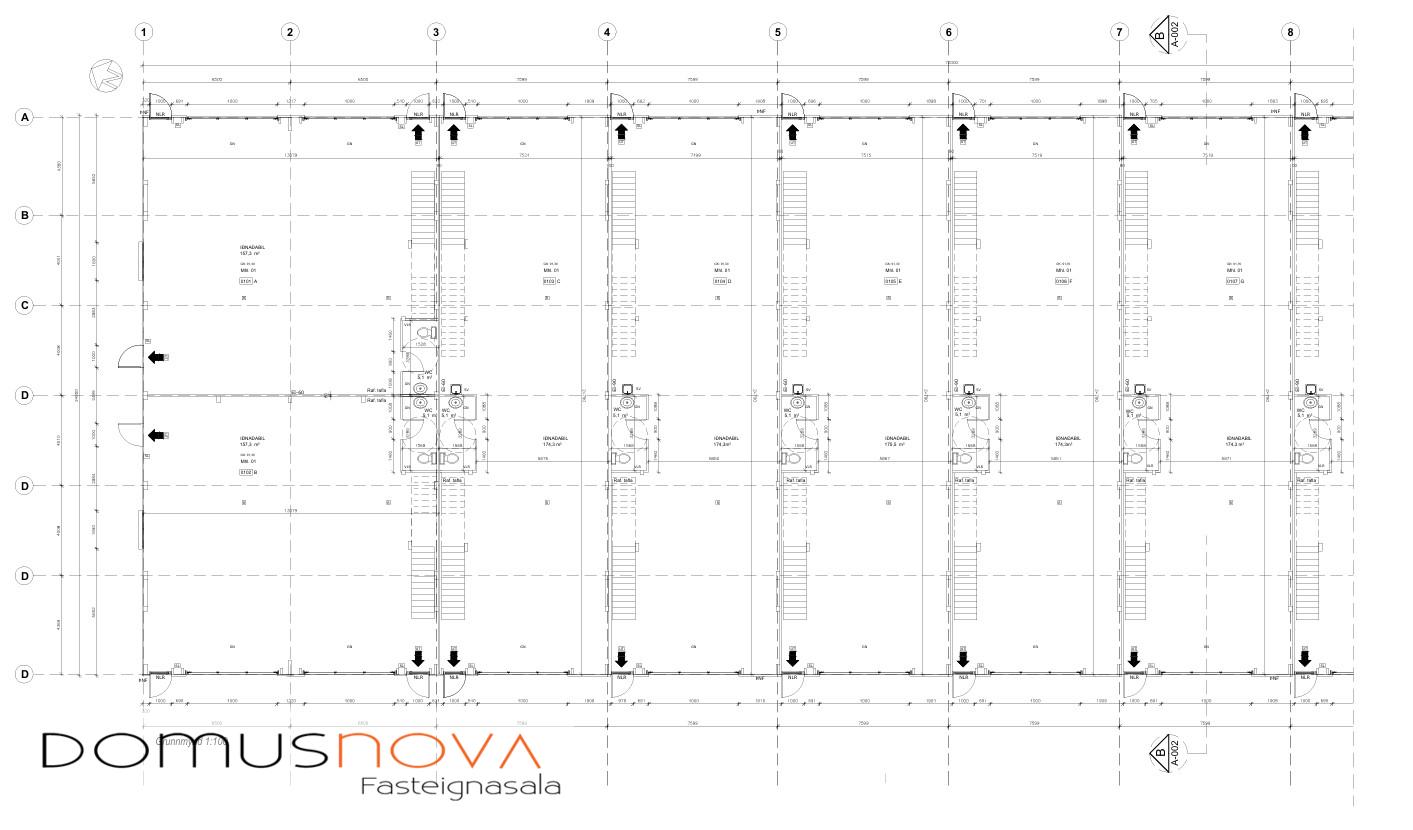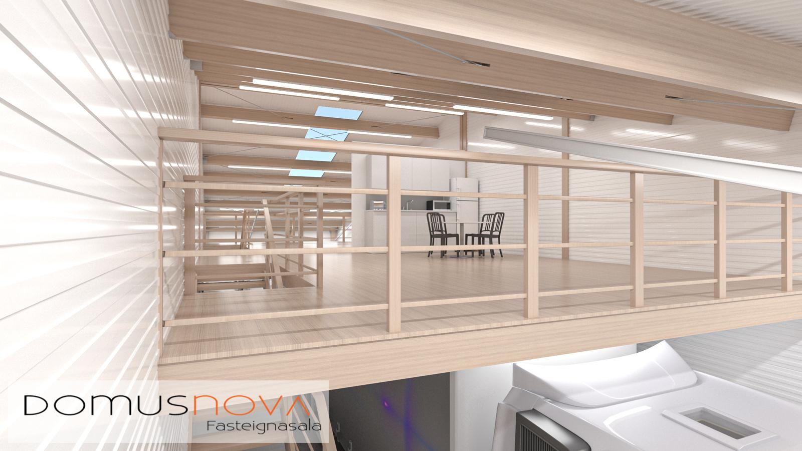 Frágangur innanhúss:Millilloft með stiga og handriði úr timbri. Innra rými er hvít stálklæðning. Ofnar í hverju bili samkvæmt teikningu. Vegghæð útveggs er 5,8 og mænishæð 9,1m. Rafmagnstafla og þriggja fasa tengill, rafmagn er utanáliggjandi samkvæmt teikningu, vinnulýsing í rýminu. Rýminn afhendast með salerni og handlaug. Gólfniðurfall frágengið. Brunavarnir: Tvær óháðar flóttaleiðir eru í hverju bili, ásamt tveimur óháðum flóttaleiðum af milligólf. Endabil eru með flóttaleið út á svalir. Viðurkennt númerað brunaviðvörunarkerfi verður í öllu húsinu skv. ÍST EN 54 og reglum HMS.