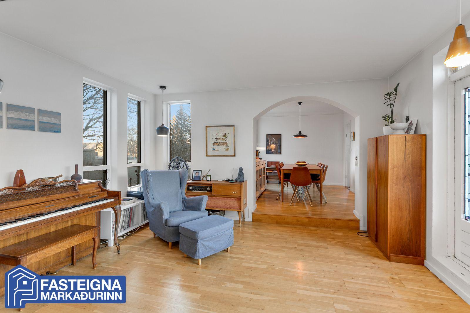 Setustofa, sem gengið er í um eitt þrep úr borðstofu, er síðari tíma viðbygging. Stofan er mjög rúmgóð, parketlögð og björt með miklum glggum inn að baklóð og útgengi á verandir til suðurs.