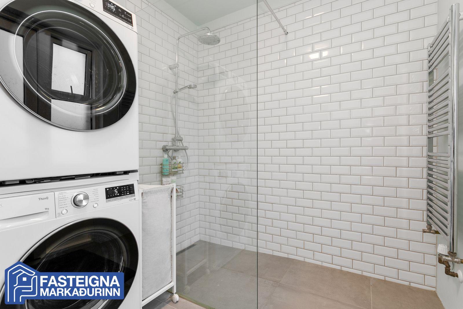 Þvottaherbergi, nýlega endurnýjað og með útgengi á baklóð. Flísalagt gólf, innrétting og flísalögð sturta með sturtugleri.