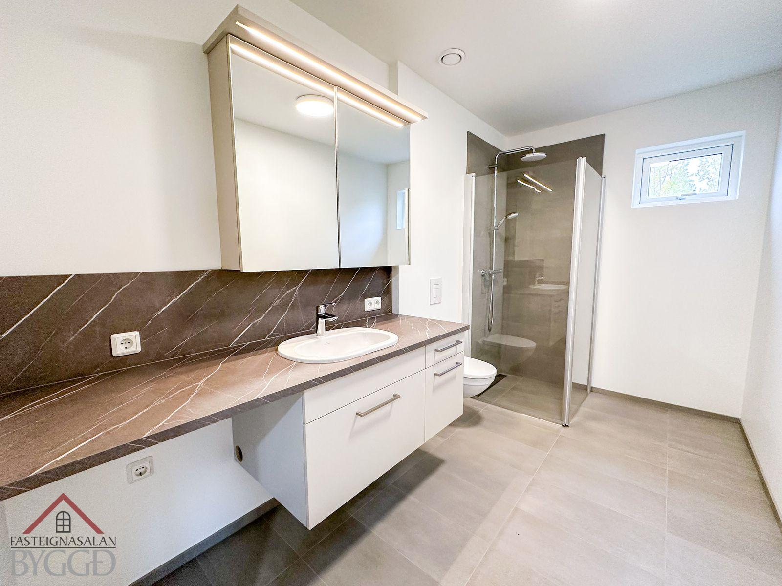Baðherbergi með flísum á gólfi og í votrými í sturtu. Sturta með glerskilrúmi og upphengt wc. Góð innrétting við vask ásamt speglaskápum og stæði fyrir þvottavél.