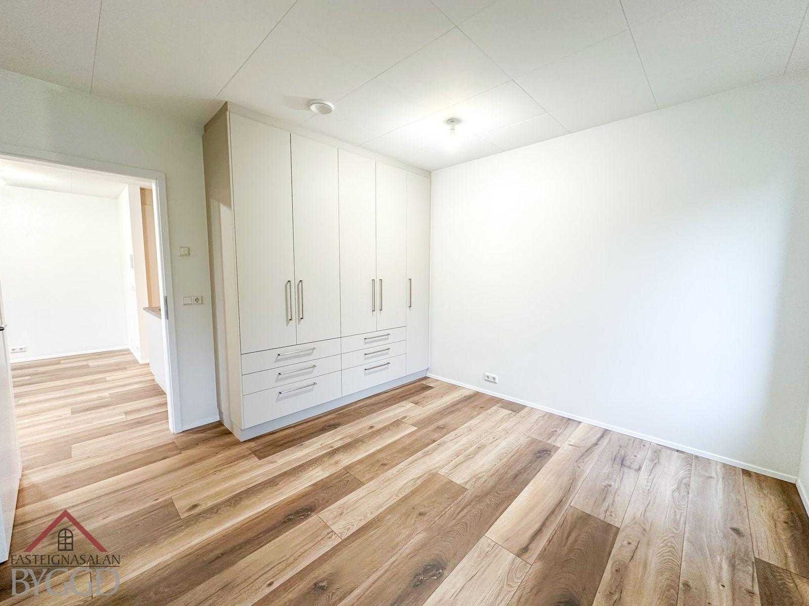 Svefnherbergin eru tvö bæði með parketi á gólfi og fataskápum.