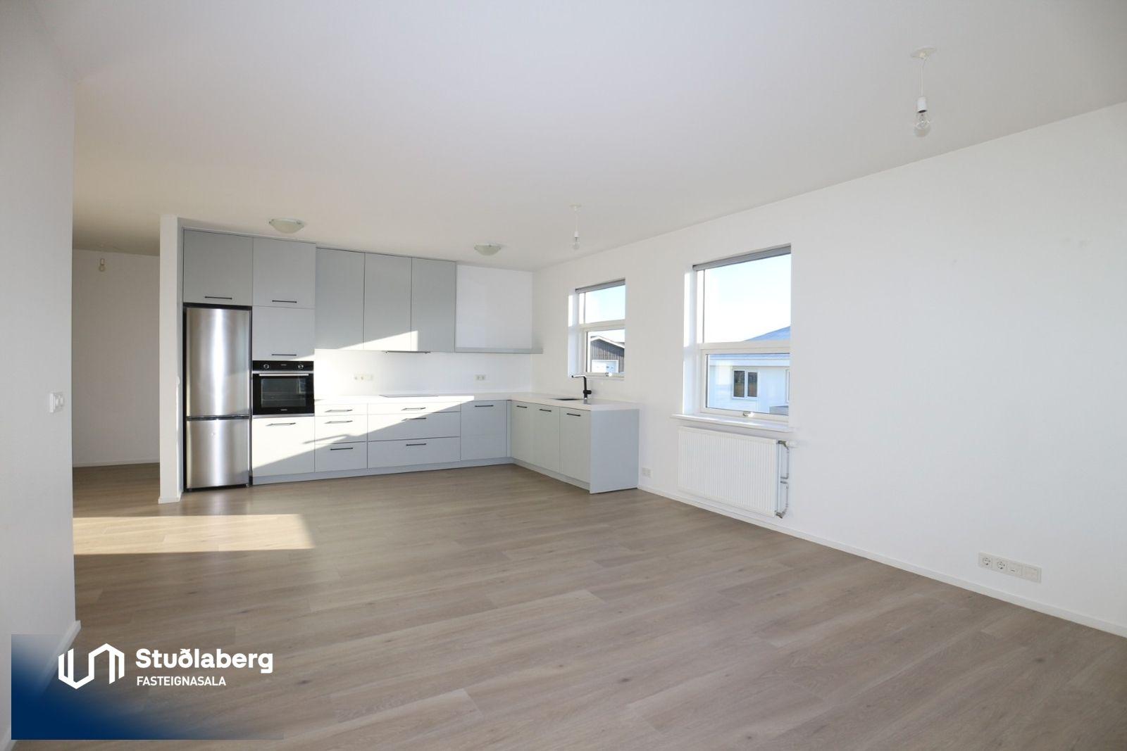 Forstofa hefur parket á gólfi og þar er skápur. Stofa hefur parket á gólfi og þaðan er hurð út á rúmgóðar svalir sem snúa í suðvestur. Eldhús hefur parket á gólfi, gráa innréttingu með hvítum quarts borðplötum og vönduðum eldhústækjum. Baðherbergi hefur flísar á gólfi og á veggjum að hluta, góða innréttingu með quarts steini og sturturými stúkað af með gleri og aðstöðu fyrir þvottavél og þurrkara. Svefnherbergin eru þrjú og hafa parket á gólfi og er skápar eru í þeim öllum.
