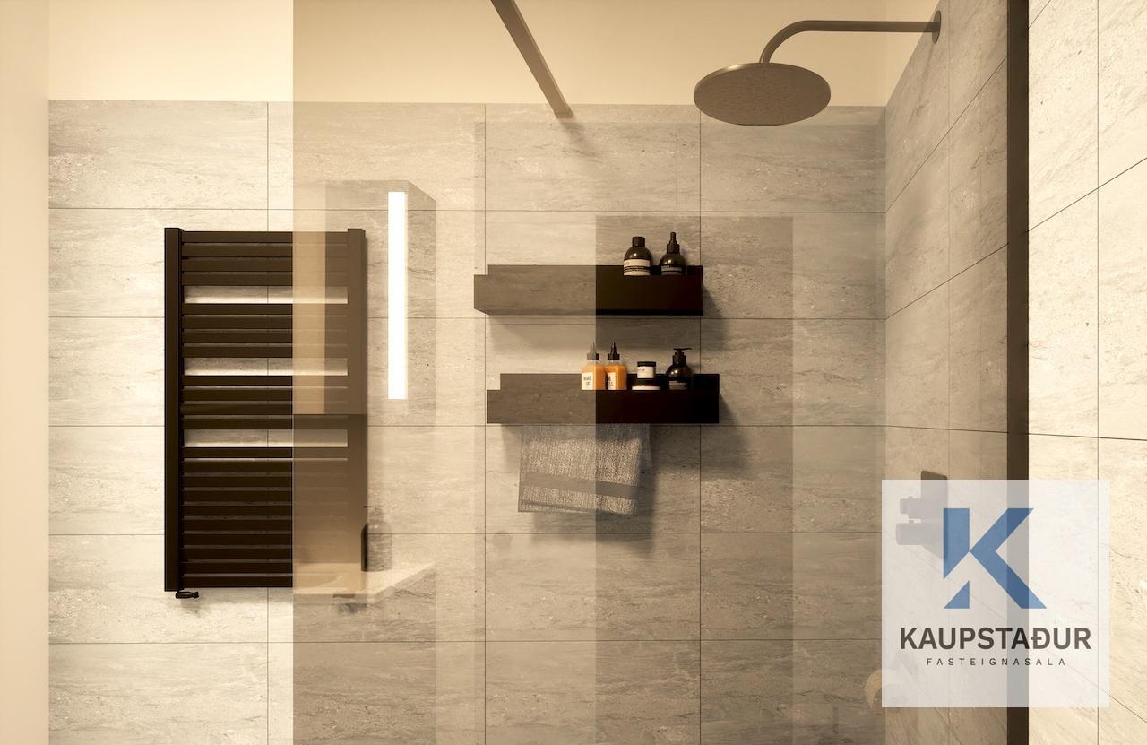 með eyju og stofu/borðstofu með gólfsíðum gluggum og útgengi á rúmgóðar suðursvalir. Svarbrún eldhúsinnrétting með viðaráferð, svartur quartz-steinn á borðum og milli skápa og hágæða ítölsk blöndunartæki úr byssubláu stáli. Öll eldhúsraftæki af hæsta gæðaflokki. Innbyggður ísskápur. Rúmgott hjónaherbergi með góðum skápum. Svefnherbergi með skáp. Baðherbergi er með “walk-in” sturtu með hertu gleri, handklæðaofni og upphengdu salerni. Leirljósar steinflísar á gólfi og veggjum, svarbrún innrétting með viðaráferð og speglaskápur með lýsingu. Innbyggð blöndunartæki á baði úr byssybláu stáli. Afþiljuð aðstaða fyrir þvottavél og þurrkara á baði. Sérgeymsla íbúðar í kjallara er merkt 0045. Í kjallara Hlíðarhorns eru sameiginlegar hjóla- og vagnageymslur og bílakjallari með fyrirkomulagi samnýtingar þar sem íbúar munu hafa forgang.