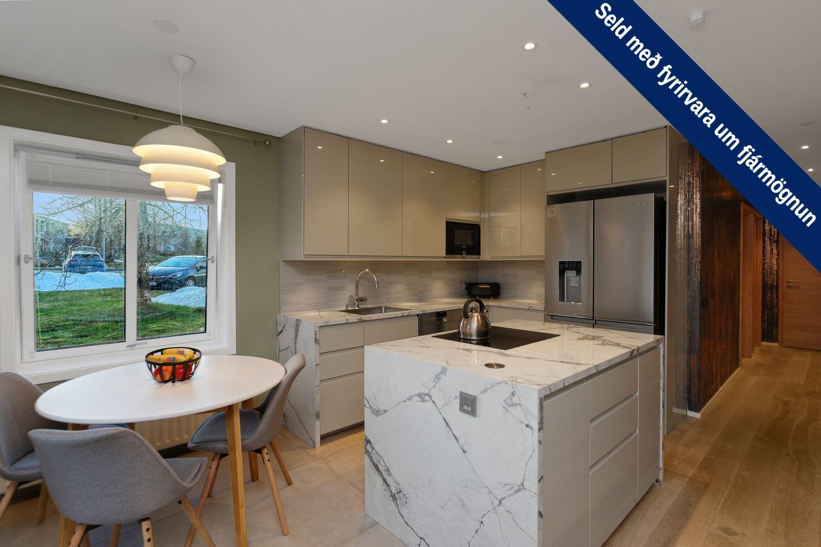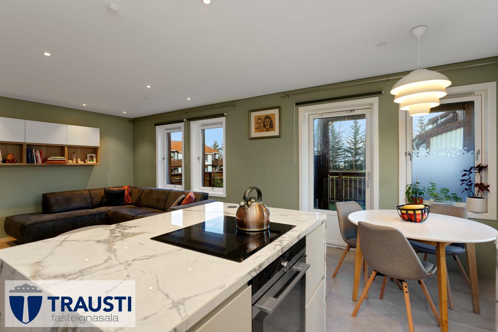 Nánari lýsing: Forstofa með fataskáp og flísum á gólfi. Einnig er fataskápur í holi. Eldhús er með fallegri innréttingu, eyju með helluborði og ofni og góðu geymsluplássi, tengi fyrir uppþvottavél og flísar á milli skápa og á gólfi. Stofa er opin við eldhús, þar er parket á gólfi og útgengi á afgirtan sérafnotareit. Baðherbergi er nýlega uppgert með fallegri innréttingu, upphengdu salerni, sturtu og handklæðaofni. Hjónaherbergi er rúmgott með fataskápum parket á gólfi. Barnaherbergi 1 er með fataskáp og parket á gólfi. Barnaherbergi 2 er með fataskáp og parket á gólfi. Þvottahús er innan íbúðar og þar er innrétting fyrir þvottavél og þurrkara og flísar á gólfi. Sérgeymsla er í sameign í kjallara hússins. Sameiginlega hjóla- og vagnageymsla er í kjallara hússins.