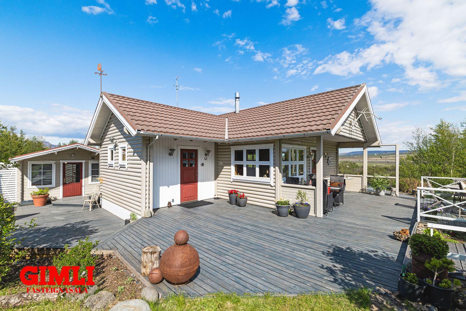 Gimli fasteignasala og Guðmunda Björnsdóttir Stackhouse kynna: Koðrabúðir 14, 806 Selfoss. Frábærlega staðsett 94,4 fm vel skipulagt heilsárshús á fallegum útsýnisstað í grónu landi við Tungufljót. Vandað hefur verið til verka í alla staði við byggingu hússins og í efnisvali. Húsið stendur á 3965 fm eignarlóð. Stór verönd/pallur er í kringum húsið með heitum potti. Gott aðgengi af bílastæði. Bókið skoðun hjá Guðmunda Björnsdóttir Stackhouse í síma 7927576, eða gudmunda@gimli.isMyndband af eigninni má sjá hérEignin samanstendur af þremur svefnherbergjum, eldhúsi, stofu/borðstofu með útgengi á verönd, baðherbergi með sturtu, verkstæði/vinnustofu, tvær geymslur, ásamt mjög góðu svefnlofti, tengi fyrir þvottavél á gangi. Veröndin er einstaklega rúmgóð með glæsilegu útsýni yfir tungufljót. Heitur pottur með loki er á verönd.