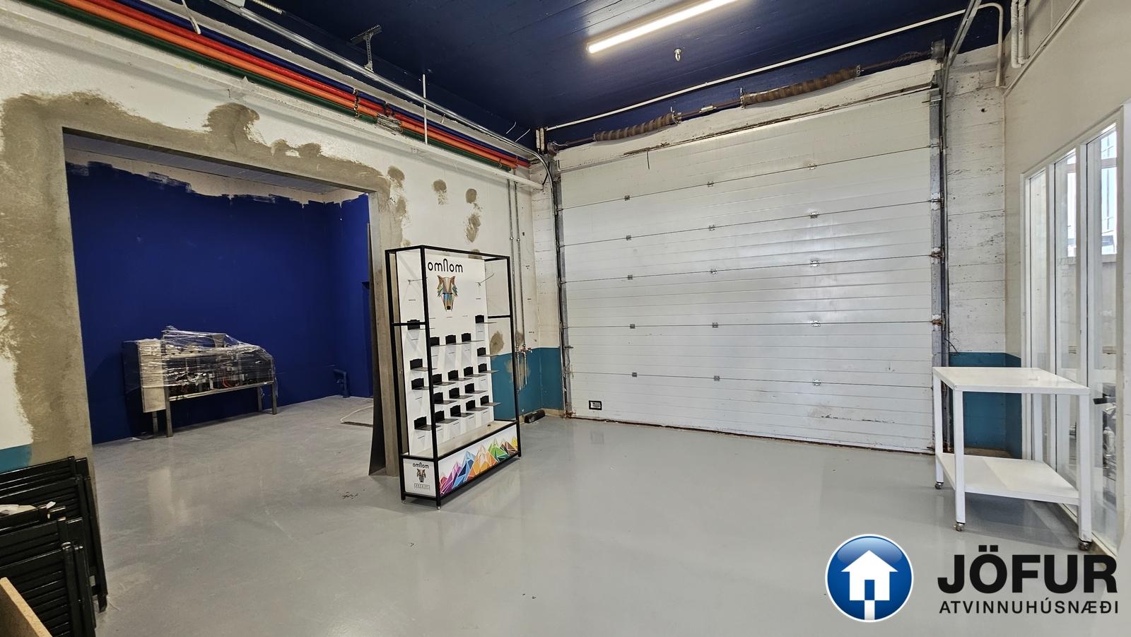 Húsnæðið skiptist í móttökurými við innkeyrsludyr, tvo stóra sali sem innangengt er á milli, kaffistofu, skjalageymslu og tvö salerni þ.a. annað með sturtu. Lofthæð er rétt um 4 m. og innkeyrsludyr eru 3,25 m. háar. Húsaleiga er án vsk.