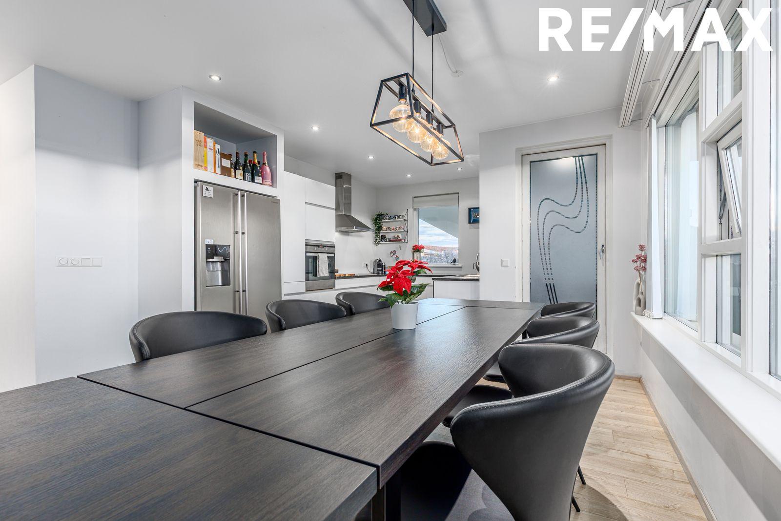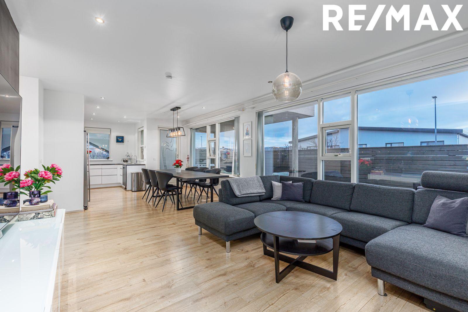 Stofa/borðstofa: Björt og rúmgóð stofa/borðstofa með parketi á gólfi og útgengi á sólríkan suðurpall með skjólveggjum. Rýmið er einstaklega hentugt fyrir fjölbreytta nýtingu. Núverandi eigendur eru með stórt og mikið borð sem tekur 12 manns þægilega í sæti, sem sýnir hversu rúmgott rýmið er. Fyrir daglega notkun er jafnframt auðvelt að hafa minna borð fyrir 6–8 manns og skapa enn opnara og léttara rými.