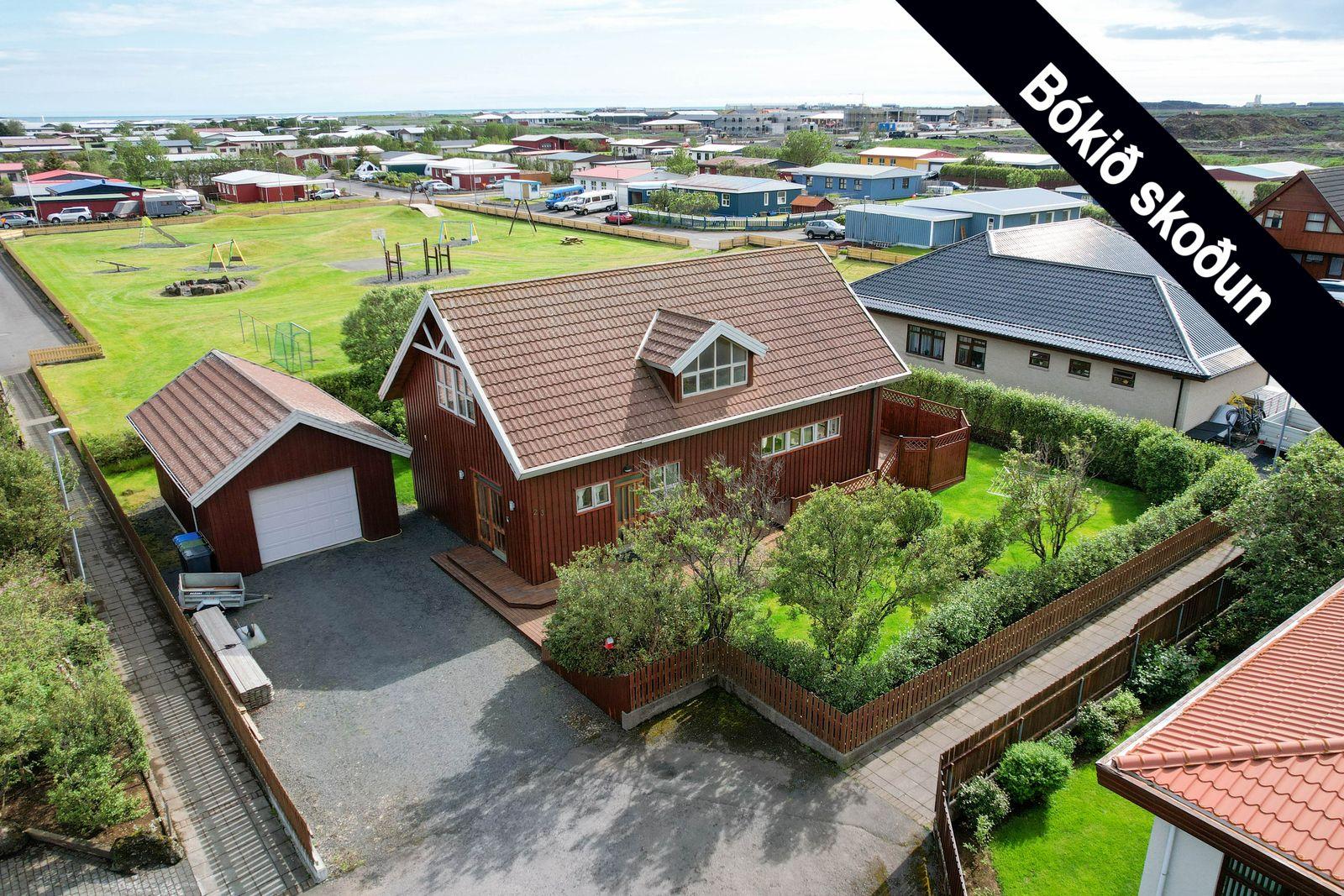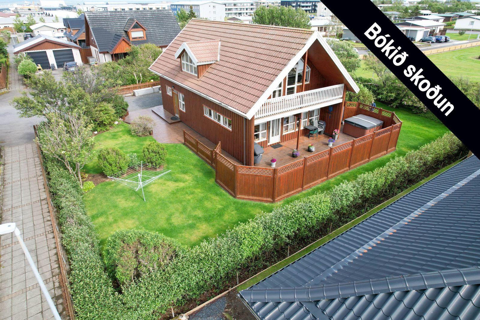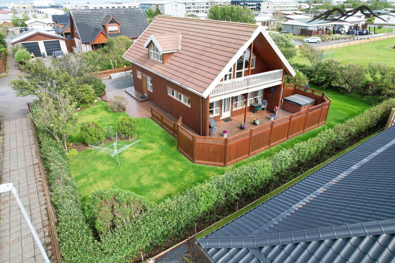 Lóð: Einstaklega falleg og gróin 797 fm lóð. Framan við húsið er möl í innkeyrslu og meðfram húsinu er timburpallur, á vesturhlið hússins er ca. 100 fm sólpallur og heitur pottur.
