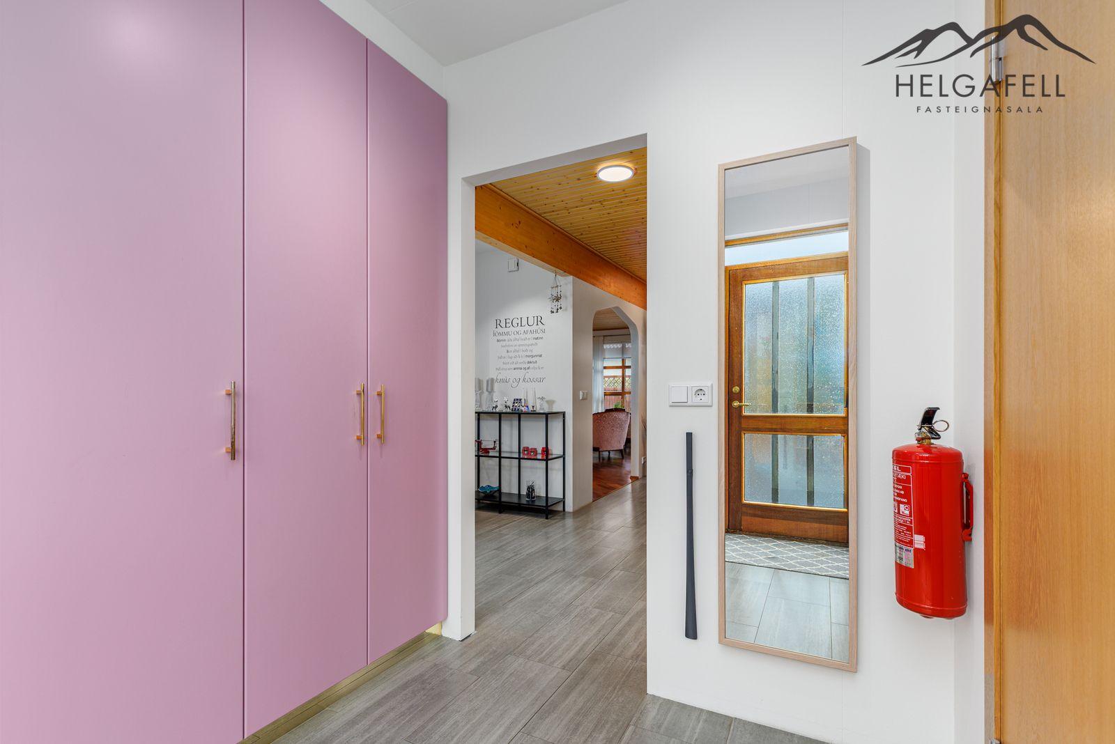 Lýsing eignar:Neðri hæð: Anddyri: Komið er inn í rúmg0tt anddyri með góðum fataskápum, flísar á gólfi.