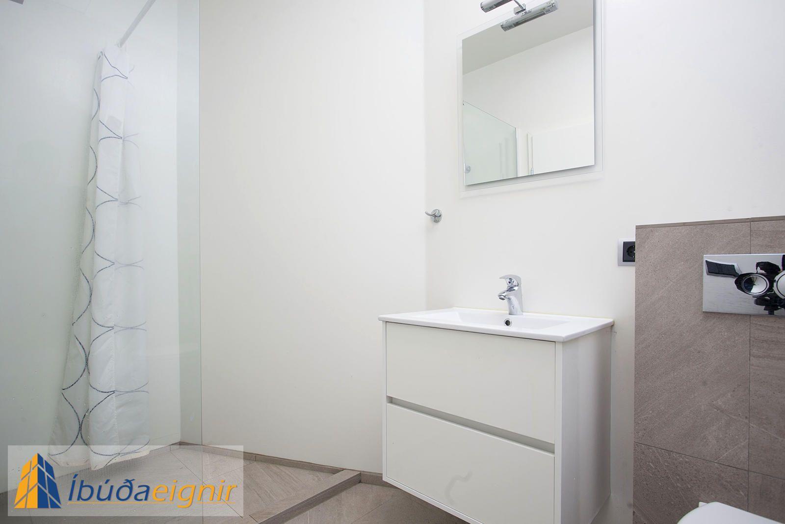 Neðri hæð:Opið rými með sjónvarpshorni með útgengi út á lóð. Mjög stórt svefnherbergi með fataskáp. Baðherbergi með hvítri innréttingu, stór sturtuklefi með glervegg ásamt. Í íbúðinni er einnig geymsla.