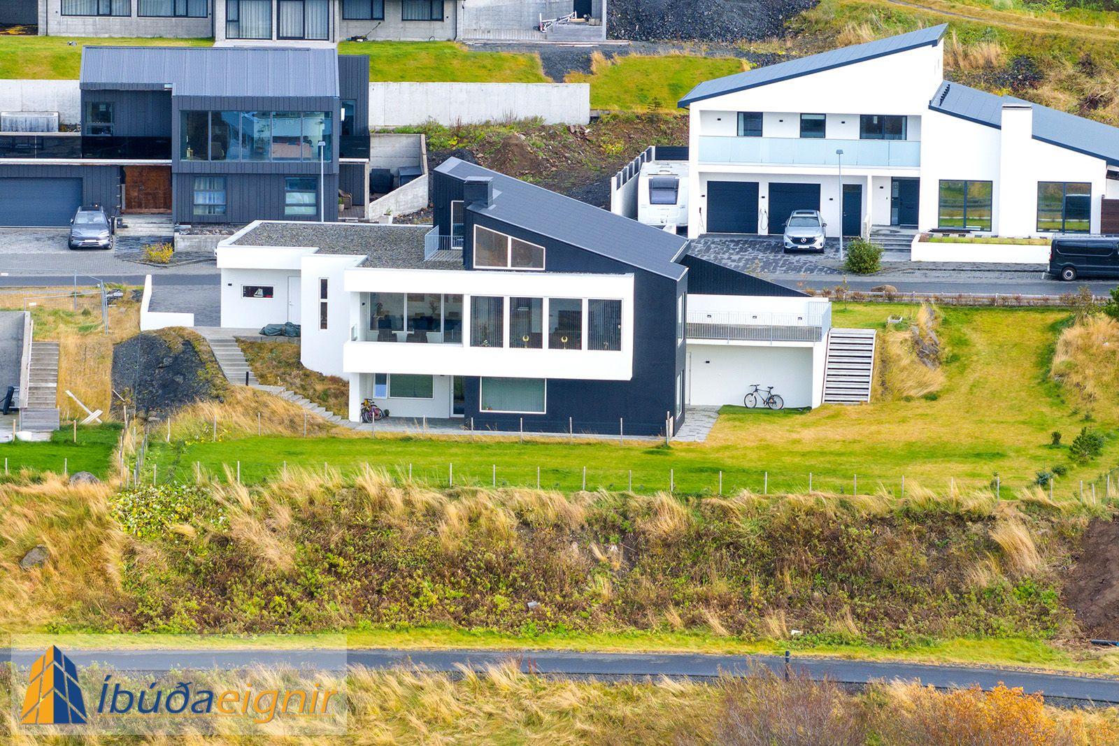 Bílskúr er þrefaldur með gólfhita, 3ja fasa rafmagni og ryksugukerfi, ryksuga, barkar og fylgihlutir fylgja kerfinu. Innaf bílskúr er mjög rúmgott rými sem nýta má sem svefnherbergi, vinnuherbergi eða geymslu. Utan á húsinu er tengd hleðslustöð fyrir rafbíl. Bílastæði er hellulagt með snjóbæðslu og lokuðu frostlögnskerfi. Lóð er frágengin.