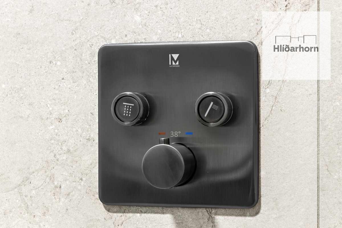 Nánari lýsing: Í anddyri eru góðir fataskápar. Gengið er úr anddyri inn gang og beint inn í rúmgott alrými, eldhús með eyju og stofu/borðstofu með gólfsíðum gluggum og útgengi á rúmgóðar suðursvalir. Svarbrún eldhúsinnrétting með viðaráferð, svartur quartz-steinn á borðum og milli skápa og hágæða ítölsk blöndunartæki úr byssubláu stáli. Öll eldhúsraftæki af hæsta gæðaflokki. Innbyggður ísskápur. Rúmgott hjónaherbergi með góðum skápum. Svefnherbergi með skáp. Baðherbergimeð “walk-in” sturtu með hertu gleri, handklæðaofni og upphengdu salerni. Leirljósar steinflísar á gólfi og veggjum, svarbrún innrétting með viðaráferð og speglaskápur með lýsingu. Innbyggð blöndunartæki á baði úr byssybláu stáli. Afmörkup aðstaða fyrir þvottavél og þurrkara á baði. Sérgeymsla íbúðar í kjallara er merkt 0046. Í kjallara Hlíðarhorns eru sameiginlegar hjóla- og vagnageymslur og bílakjallari með fyrirkomulagi samnýtingar þar sem íbúar munu hafa forgang.