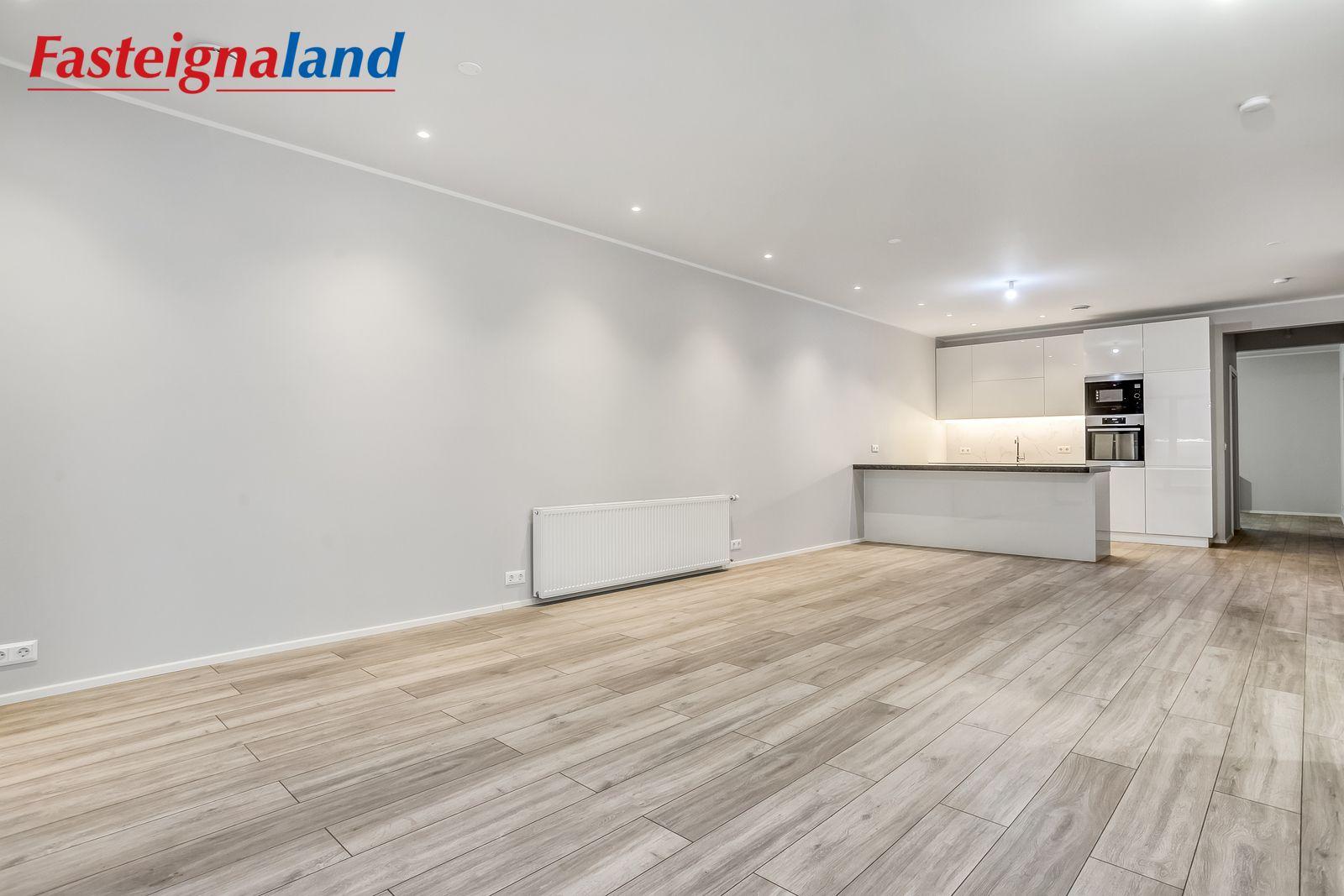 Eldhús - Eldhúsinnréttingar eru hvítar og eru sérsmíðaðar með glans áferð. - Höldur eru ekki sýnilegar - U laga eldhús með eldhúshellu þar sem hægt er að hafa 2-3 stóla við. - Borðplata er úr Corian & er eldhusvaskur hannaður ofan í plötuna í sama efni. Liturinn er dökkur marmaraáferð.