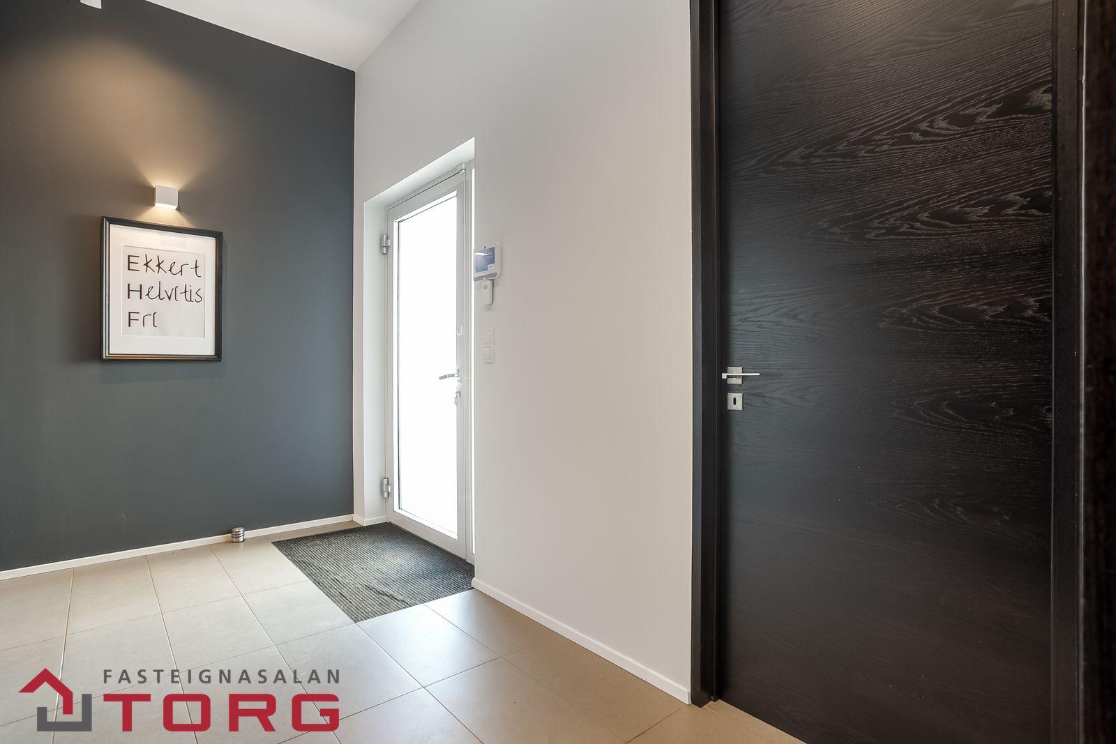 Eignin skiptist í anddyri, hol, stofu, eldhús og borðstofu, þrjú til fjögur svefnherbergi, þar af glæsileg hjónasvíta með baðherbergi, tvö baðherbergi (þar af eitt inn af hjónasvítu) og gestasalerni, þvottahús og geymslu. Aukin lofthæð er í öllum rýmum. Útgengt er út í lokaðan garð frá eldhúsi/stofu. Garðurinn er einstaklega stílhreinn, með steyptum palli, timburpalli við og bakvið bílskúr og grasfleti. Gengið er inn í bílskúr frá garði, þar sem útbúin hefur verið flott líkamsræktaraðstaða með öllum helstu tækjum.
