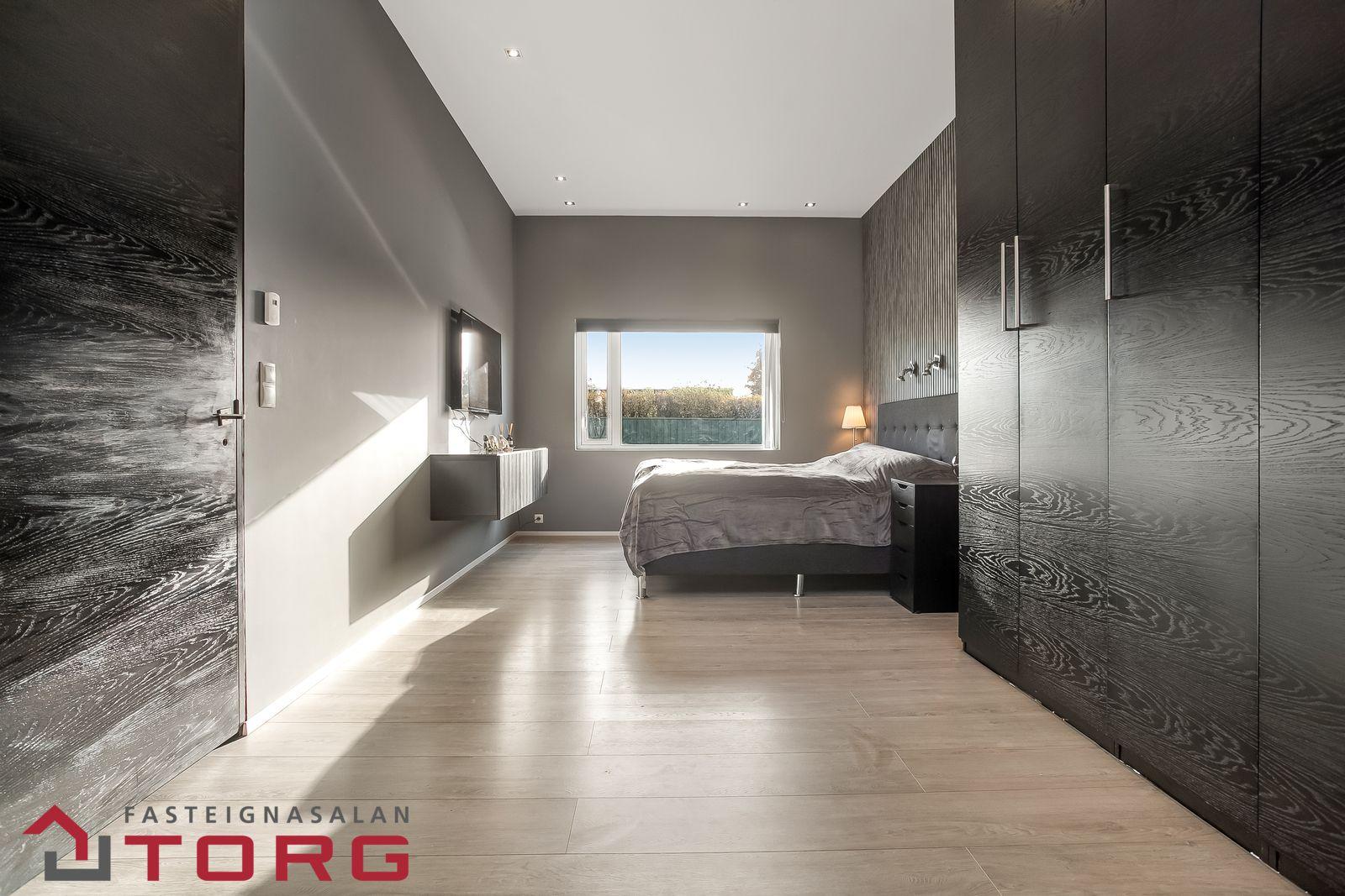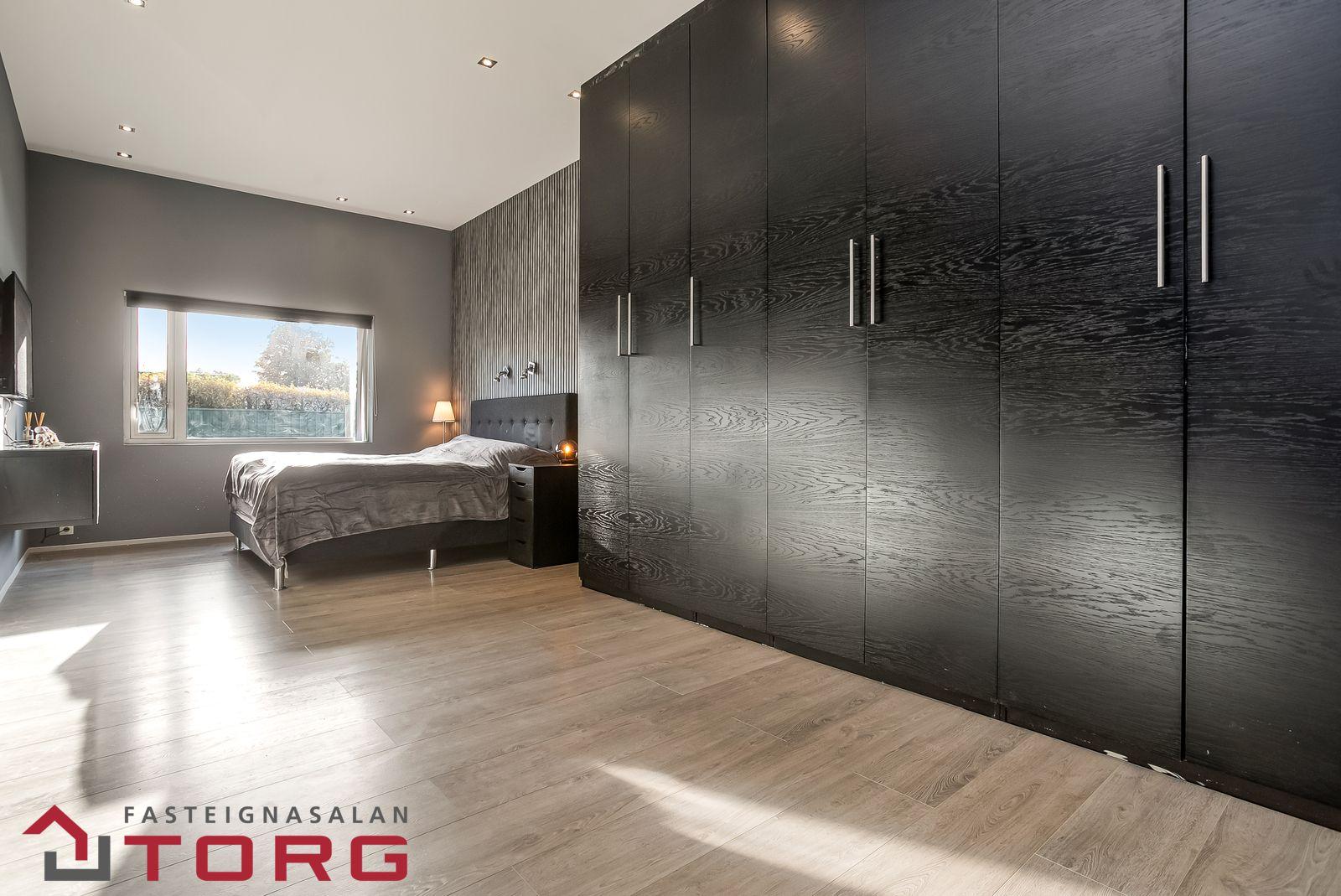 Hjónasvítan er rúmgóð og með miklu skápaplássi og baðherbergi inn af.