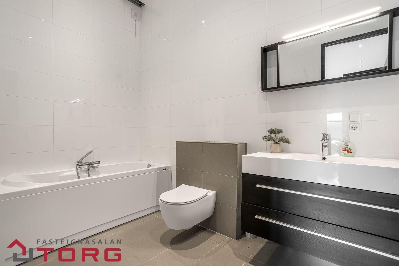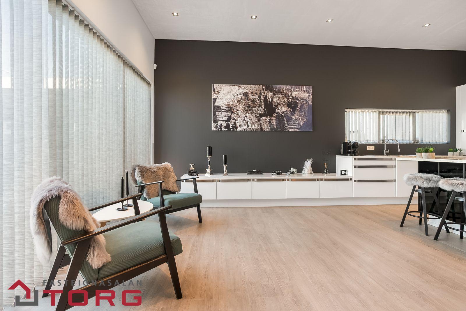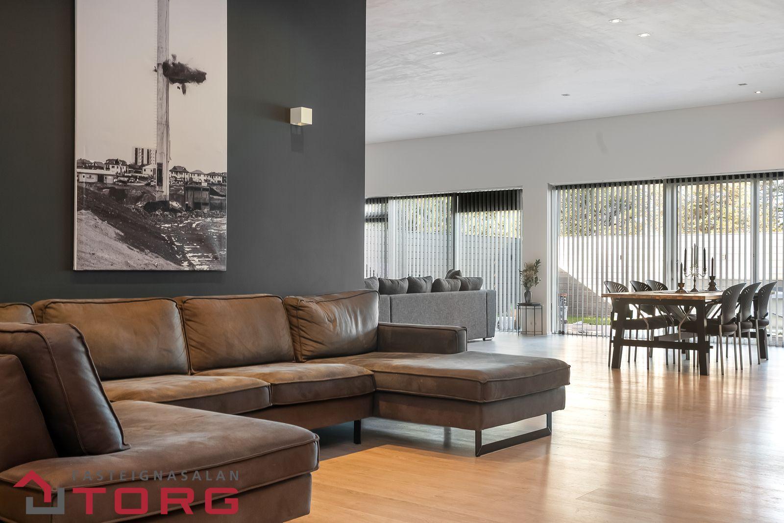 Eignin er öll hin glæsilegasta með aukinni lofthæð, hita í öllum gólfum, fallegum innréttingum, og stein á borðum í eldhúsi. Lóðin er 673,0 fm fullfrágengin, með snjóbræðslu í plani.