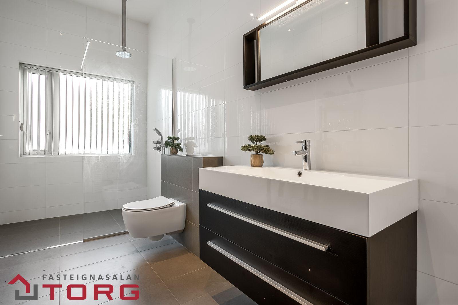 Aðal baðherbergi er með walk-in sturtu og upphengdu klósetti. Innnrétting er dökk og með hvítri plötu með innbyggðum vaski.